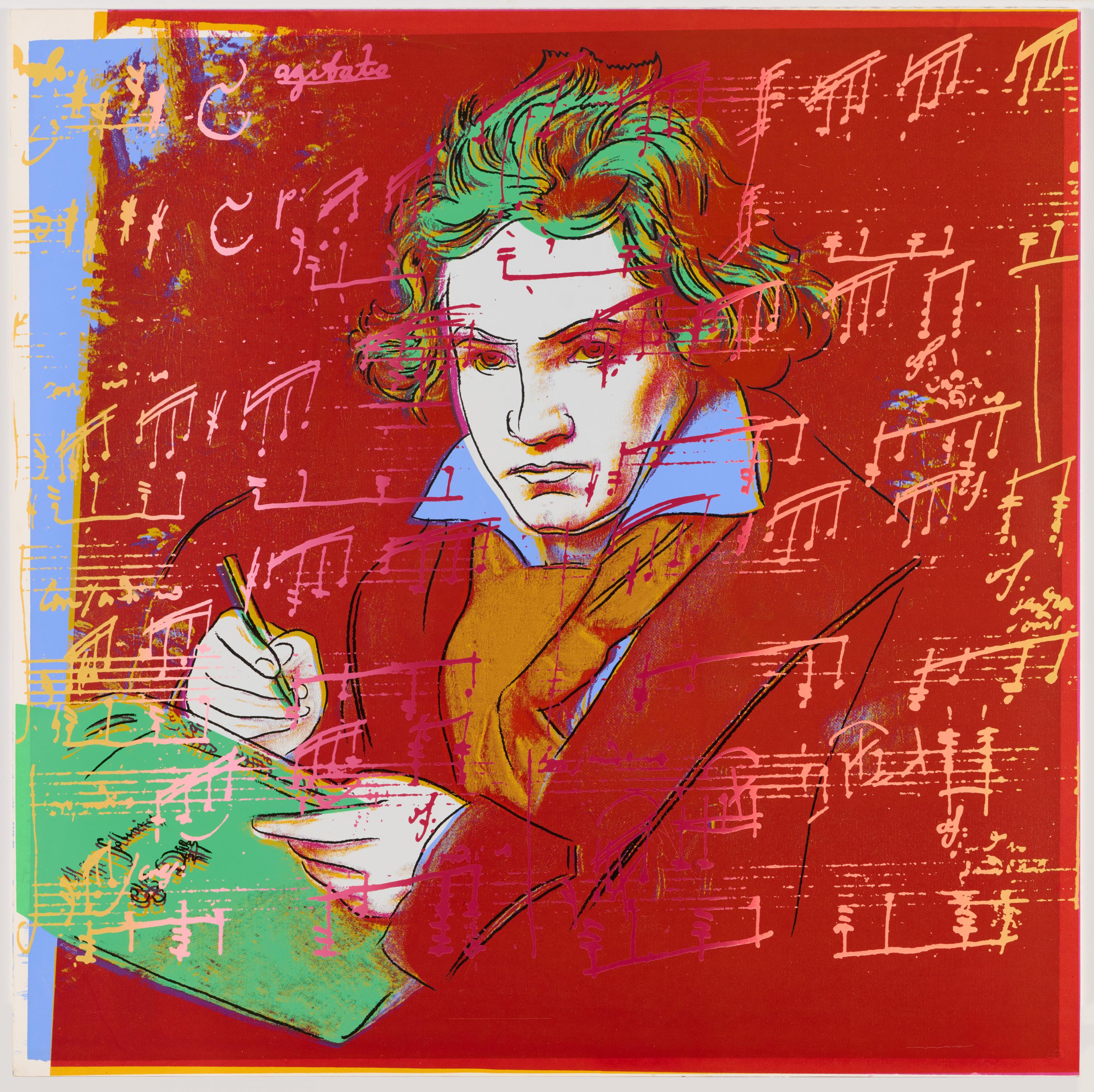 Für diese Serie greift Warhol auf ein bereits berühmtes Porträt des Künstlers Joseph Karl Stieler (1781-1858) aus dem Jahr 1820 zurück, das die Persönlichkeit des Künstlers wie kein anderes einfängt. Der ungeduldige Gesichtsausdruck, die Löwenmähne und die Hände hebt Warhol in seiner Interpretation gekonnt durch die Verwendung von Farbe hervor. Der restliche Körper verschmilzt mehr oder weniger mit dem Hintergrund. Warhol treibt Stielers visuelle Identifizierung des Komponisten jedoch noch einen Schritt weiter, über die reine Gesichtserkennung hinaus. Warhol begnügt sich nicht damit, Beethovens Handwerkszeug, das Manuskript und die Feder, zu benutzen, um auf das Talent des Komponisten anzuspielen, sondern lässt die Musik direkt über das Porträt selbst laufen. In Stielers Gemälde hält Beethoven die Partitur seiner späten "Missa solemnis" in der Hand. Die Messe zählt zu einem seiner größten Werke. Warhol wählt jedoch die Partitur seiner Klaviersonate Nr. 14 in cis-Moll - besser bekannt als die Mondscheinsonate - für sein Porträt aus. Mit der Verwendung der populäreren Mondscheinsonate beweist Warhol einmal mehr, dass er nicht ein Abbild schaffen möchte, sondern ein Klischee der Wirklichkeit, der die Person zu Legenden werden lassen.