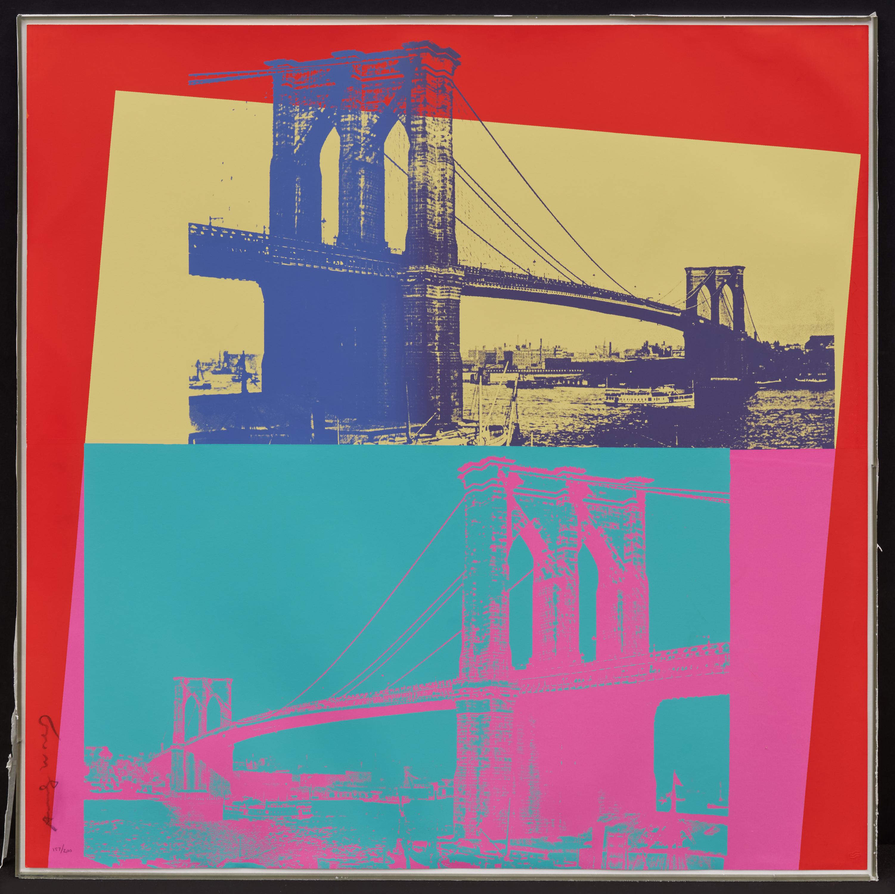 In dieser Farbserigrafie zeigt Warhol die berühmte Brooklyn Bridge, das Wahrzeichen, das Manhattan und Brooklyn verbindet, in zwei spiegelbildlich angeordneten Ansichten. Leuchtende Farbflächen in Rot, Gelb, Türkis und Magenta überziehen das Motiv und verleihen der Darstellung eine eindrucksvolle visuelle Dynamik. Die architektonische Silhouette der Brücke wird durch kräftige, kontrastierende Farben und das charakteristische serielle Prinzip Warhols in ein Sinnbild urbaner Energie verwandelt. Entstanden anlässlich des 100-jährigen Jubiläums der Brücke, verbindet das Werk Warhols Faszination für die Symbole amerikanischer Identität mit seiner unverwechselbaren Pop-Art-Ästhetik. "Brooklyn Bridge" steht exemplarisch für Warhols späte Druckgrafik, in der er klassische Themen der Stadtlandschaft mit den Mitteln der Massenkultur zu zeitlosen Ikonen amerikanischer Moderne erhebt..
