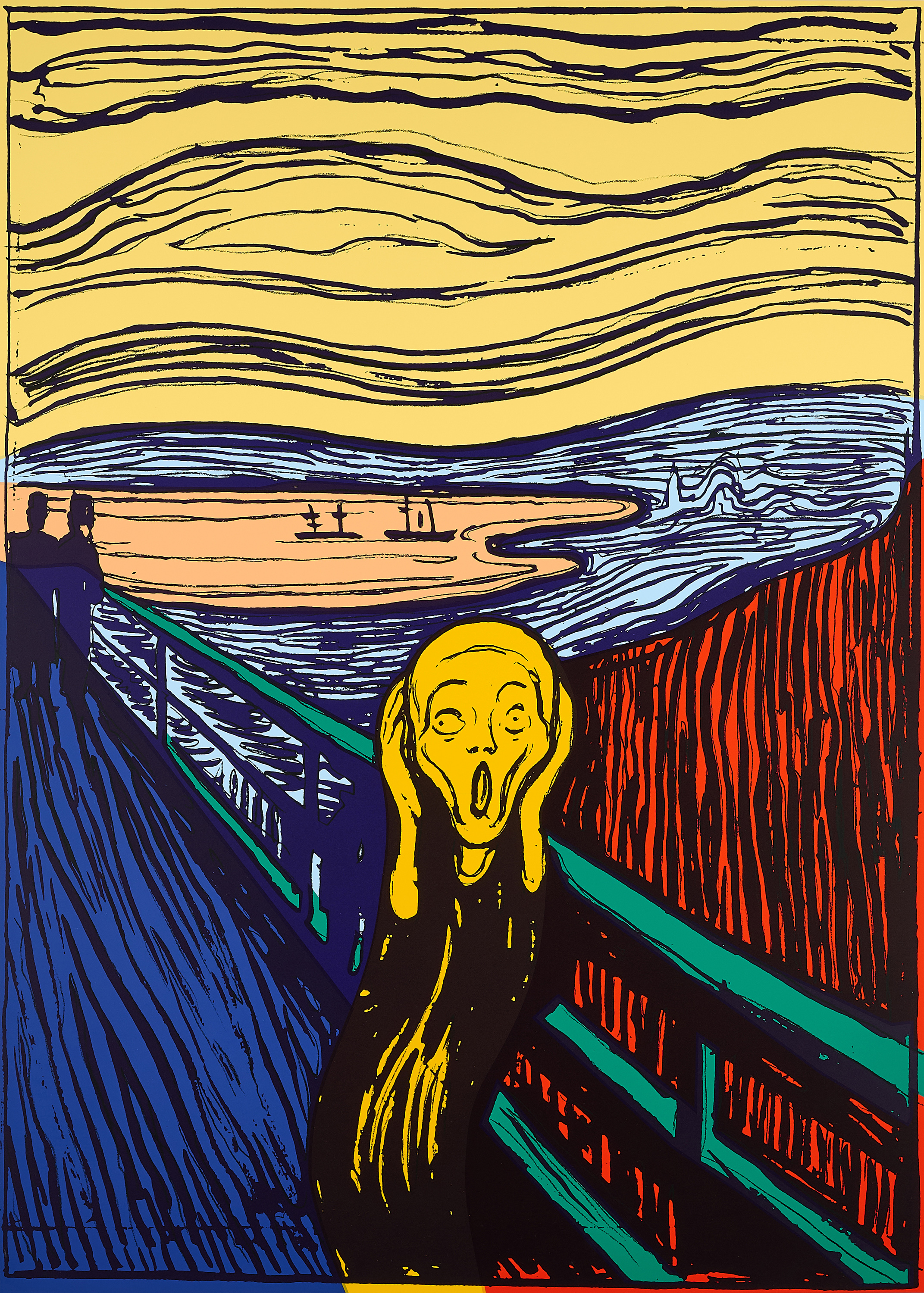 Verso mit den Stempeln "Fill in your own signature" und dem Stempel des Herausgebers in blauer Farbe. Bezieht sich auf die ursprünglich 1984 konzipierten Serigrafien Andy Warhols nach der Lithografie "Der Schrei" von Edvard Munch von 1893-95. Mit dem beiliegenden Zertifikat des Herausgebers.