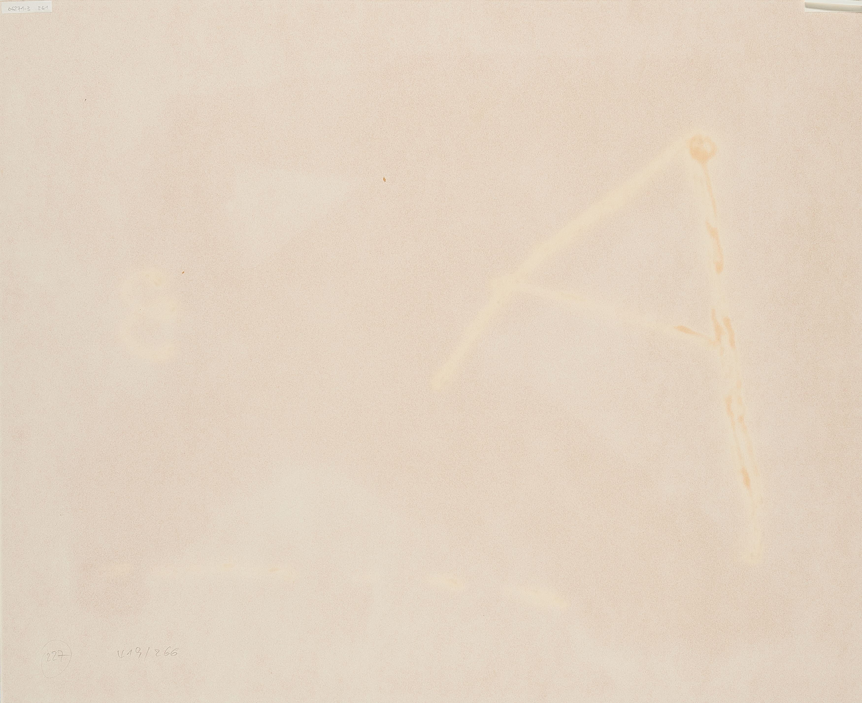 Blatt gebräunt, in den Randbereichen unregelmäßig gebräunt. Verso Reste alter Montierung in den oberen beiden Ecken. Ansonsten befindet sich das Blatt in einem guten Zustand.