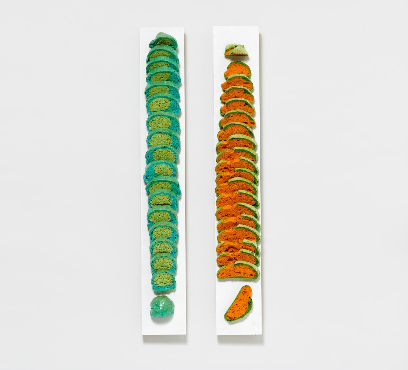 "Pain surprise". Multiple. 1971. Mischtechnik (zwei mit Lebensmittelfarbe gefärbte Baguettebrote, in Scheiben geschnitten), Auf weißer Holzplatte montiert, in Plexiglaskasten.