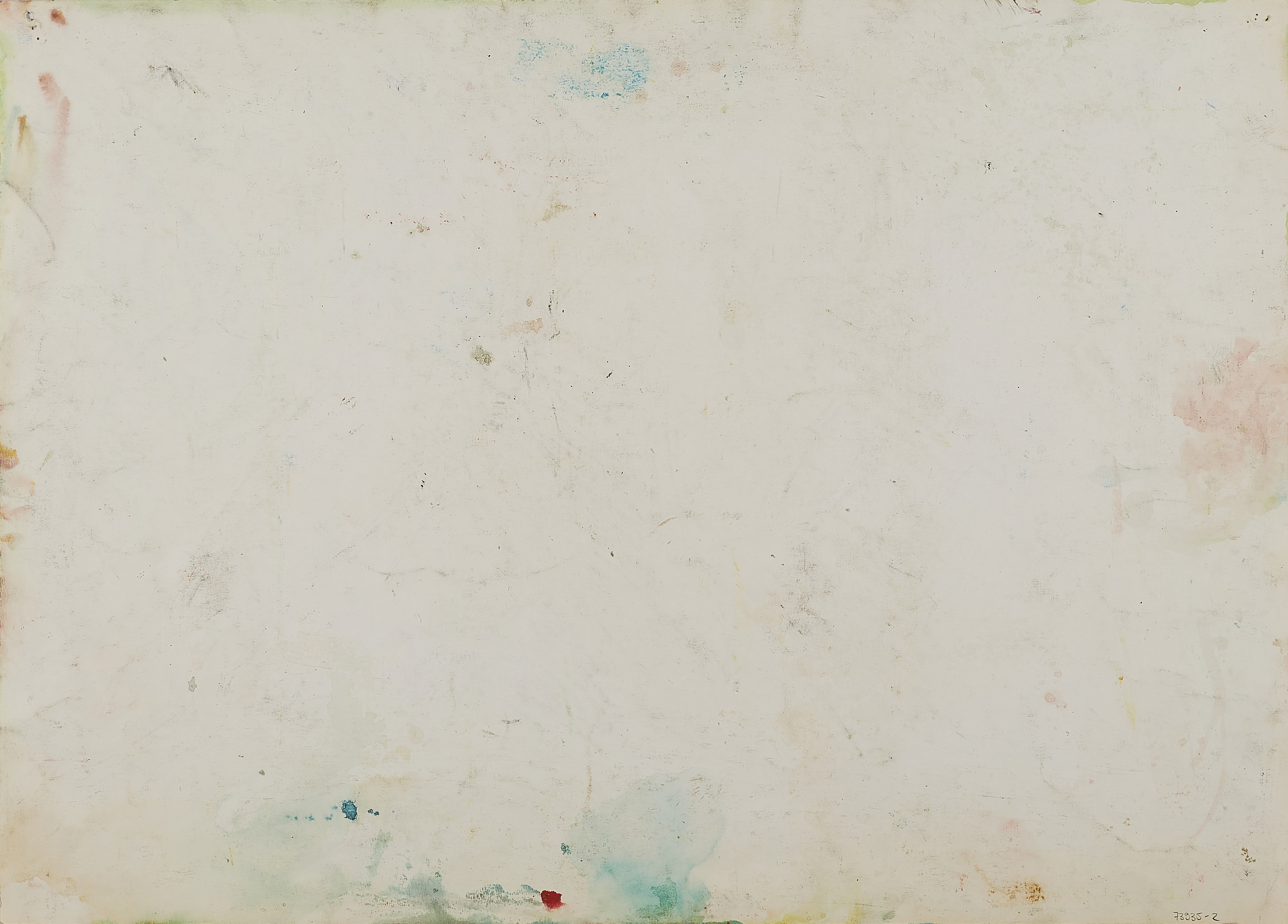 Arbeitsspuren. Stecknadellöcher in den Ecken, bzw. kleinerer Papiereinriss in der oberen rechten Ecke. Minimale Knickspuren in den Ecken, insbesondere unten links. Ansonsten befindet sich die Arbeit in einem guten Zustand.