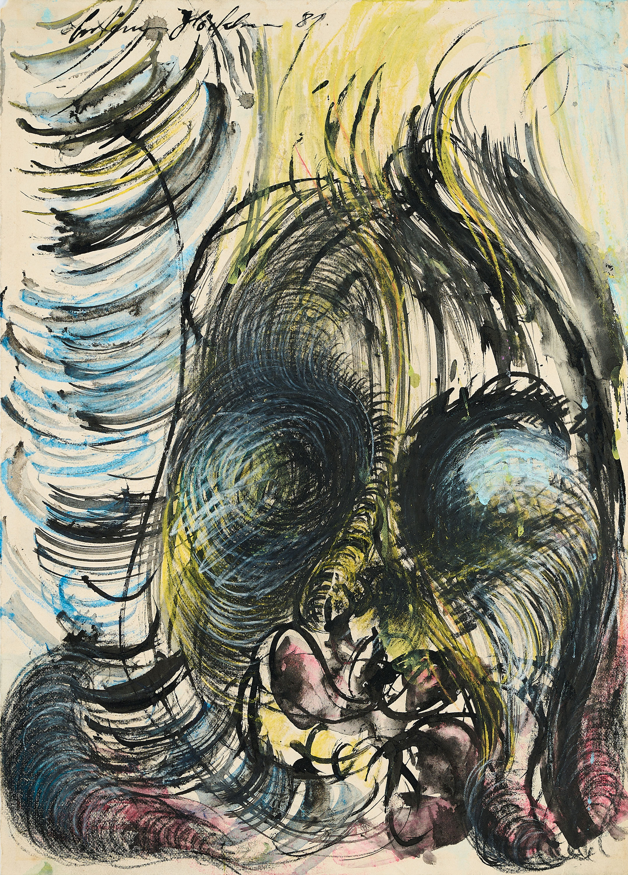 Technik: Tusche, Gouache und Farbkreide auf Bütten.