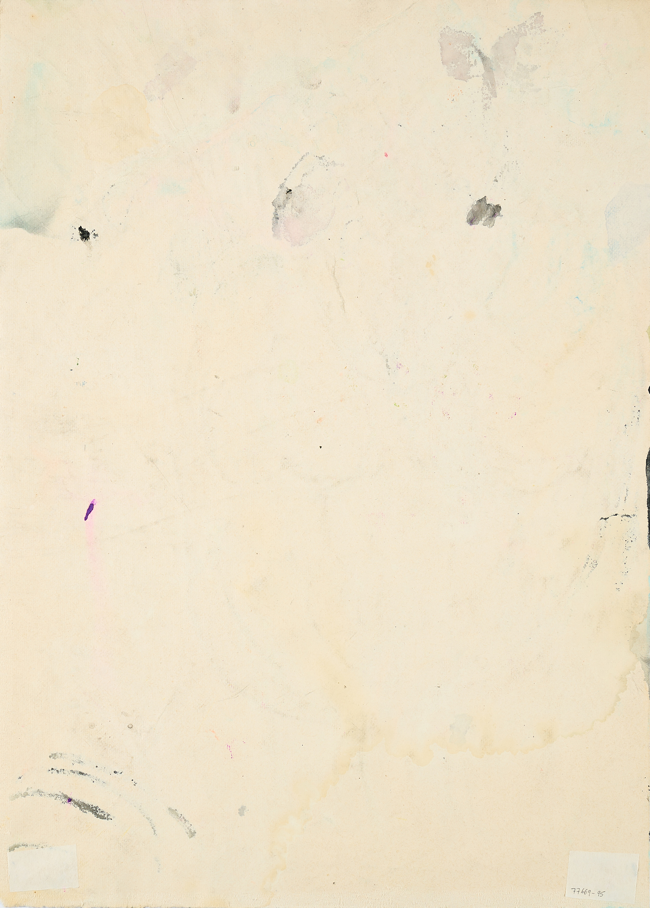 Arbeitsspuren. Minimal gebräunt. Herstellungsbedingt minimal gewellt. Kanten leicht abgegriffen. Vereinzelt leichte Griffspuren. Stecknadellöcher in den oberen Ecken. Riss in der unteren Mitte (ca. 3cm). Knickspur im unteren linken Eckbereich. Verso minimal gebräunt. Arbeitsspuren, minimale Verschmutzungen und Reste alter Montierung. Ansonsten guter Zustand.