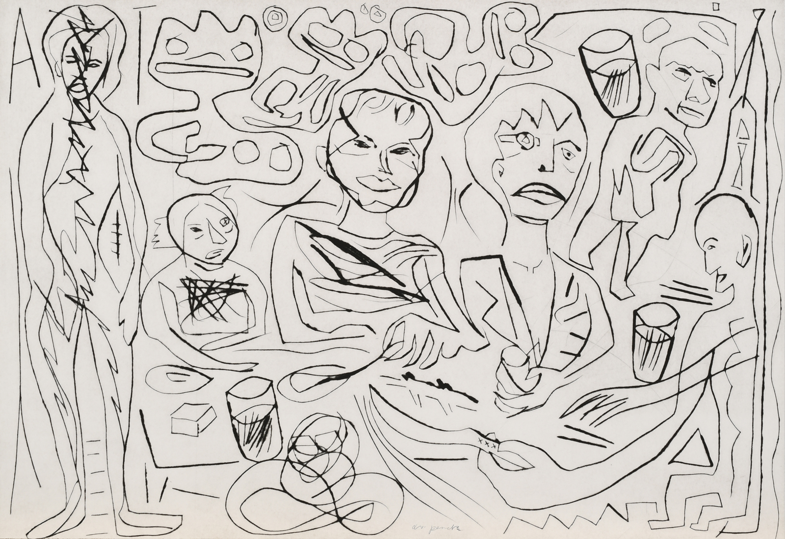 Bei Schneiderweißens. 1985. Radierung auf Velin. 64,5 x 93,5cm Signiert. Maximilian Verlag, München (Hrsg.).