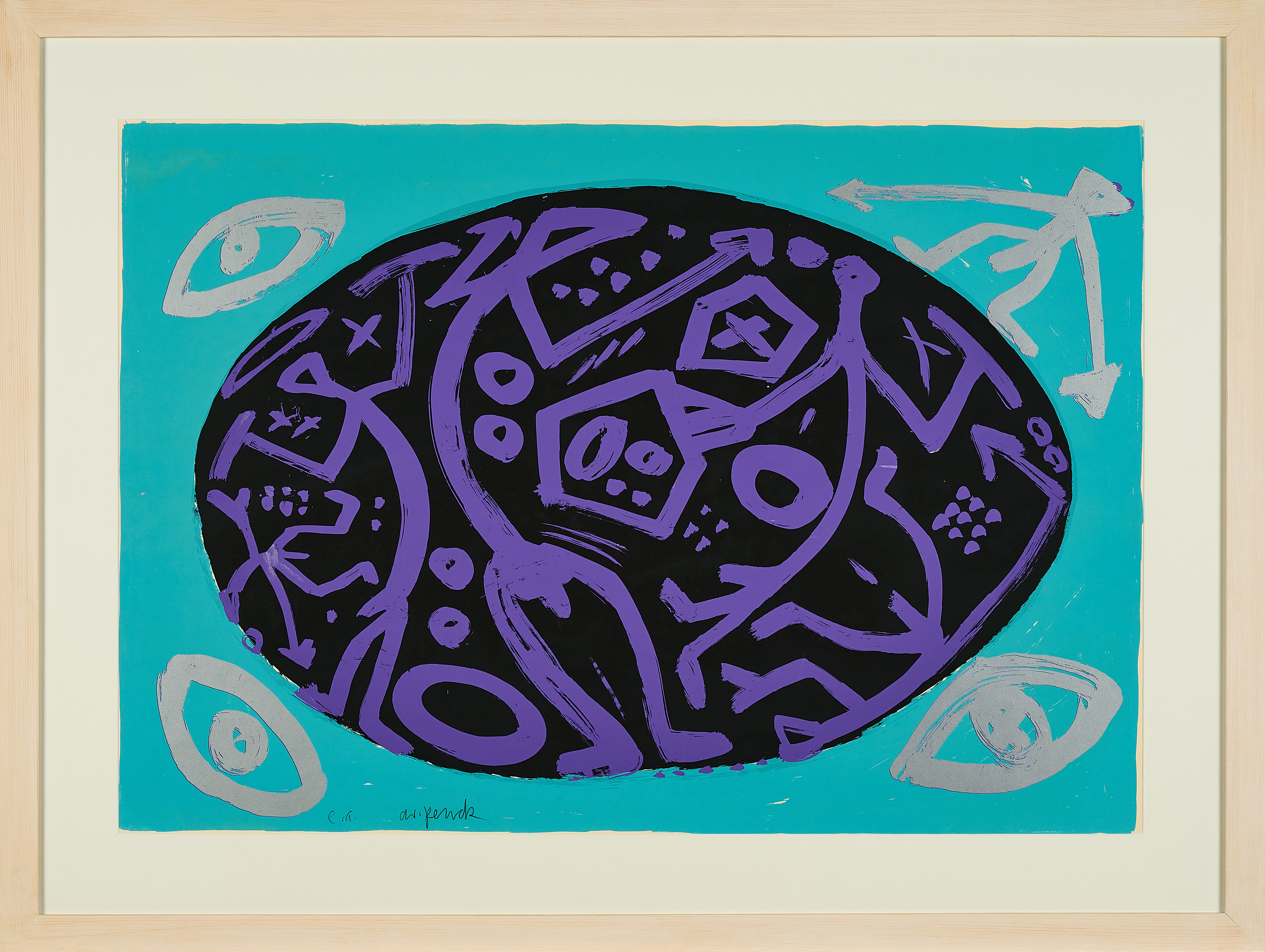 Minimal gebräunt. Im violetten Bereich im Zentrum minimale druckbedingte Fehlstellen. Vereinzelt minimale Griffspuren. Ansonsten sehr guter Zustand. Verso montiert. Im Rahmen beschrieben.