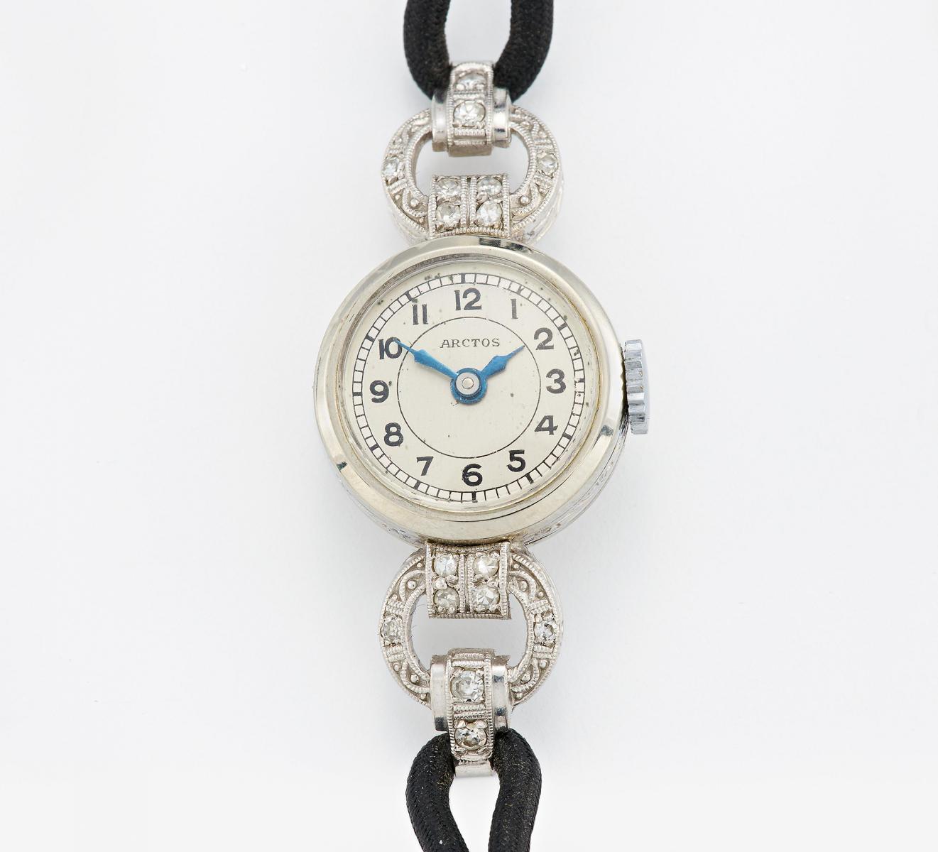 Gehäuse/Armband: 585/- Weißgold, gest., diamantgeziert, Seidenband, Zffbl. lackiert, bedruckt, Zeiger gebleut, Indizes schwarz.