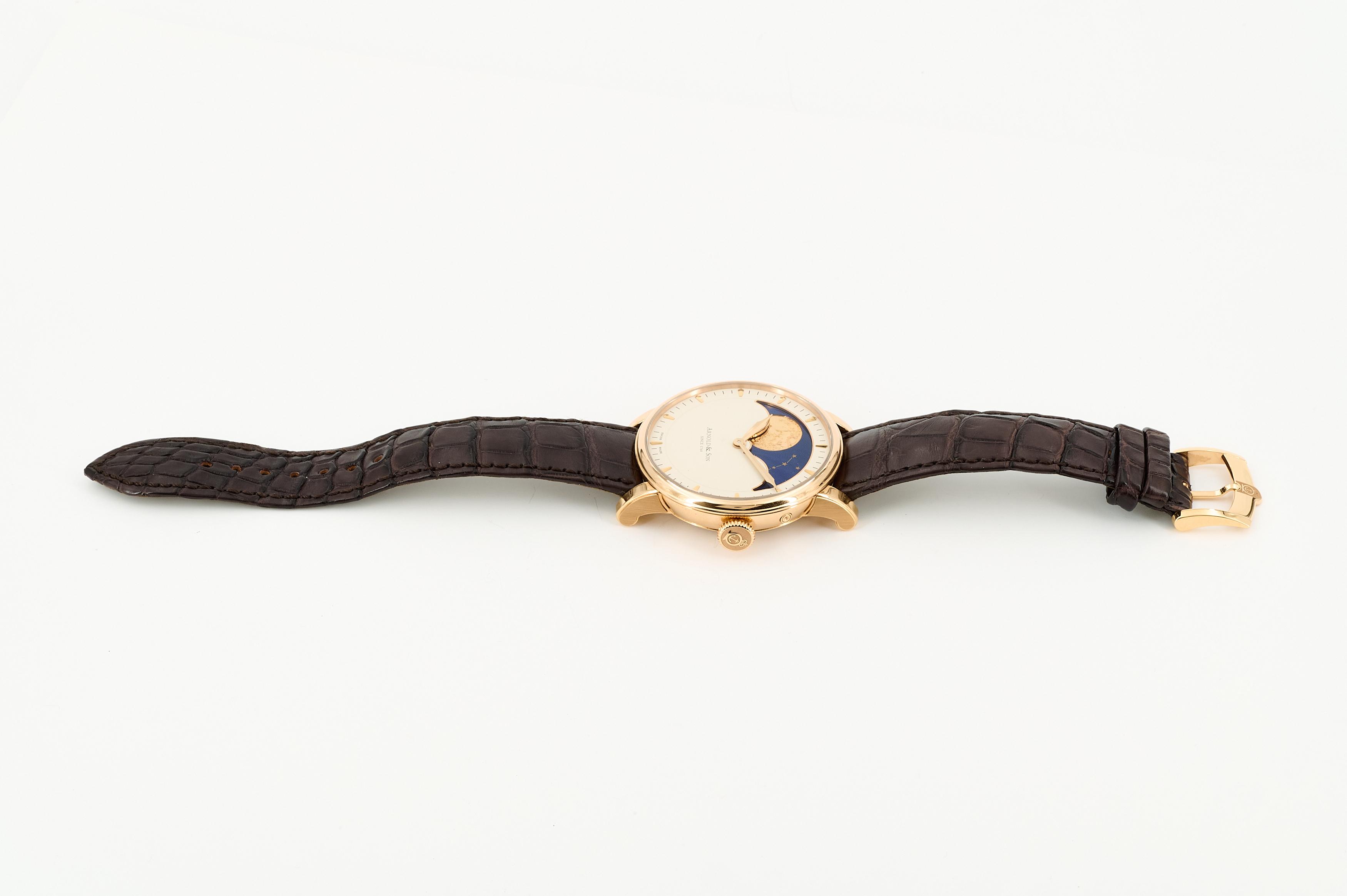 Gehäuse/Armband: 750/- Roségold, Lederarmband mit Dornschließe, Zffbl. weiß, Zeiger und Indizes golden.