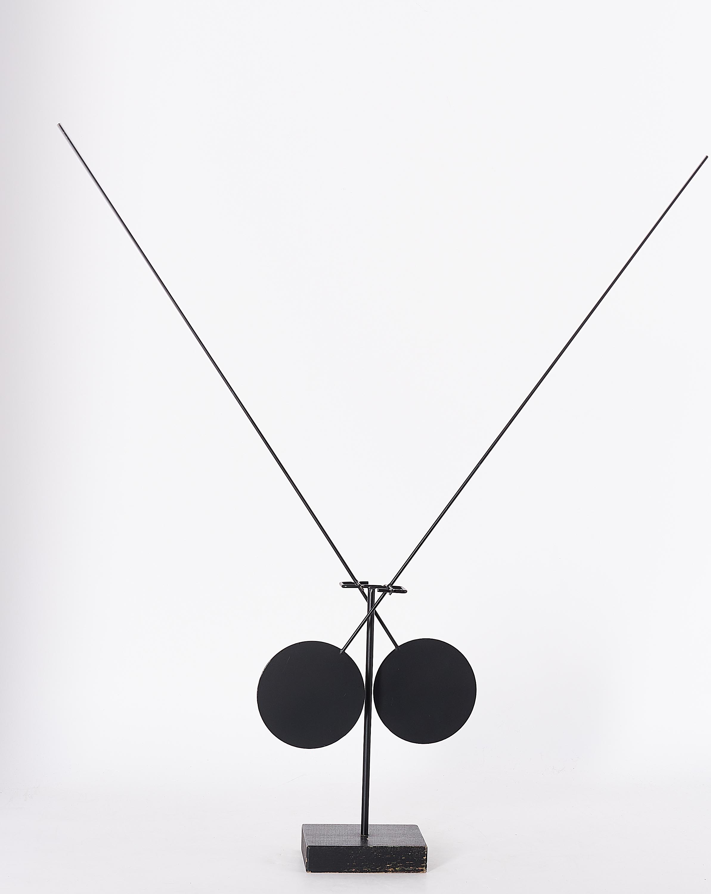 Technik: Pendelobjekt. Eisen, mattschwarz gefasst und Holzsockel.