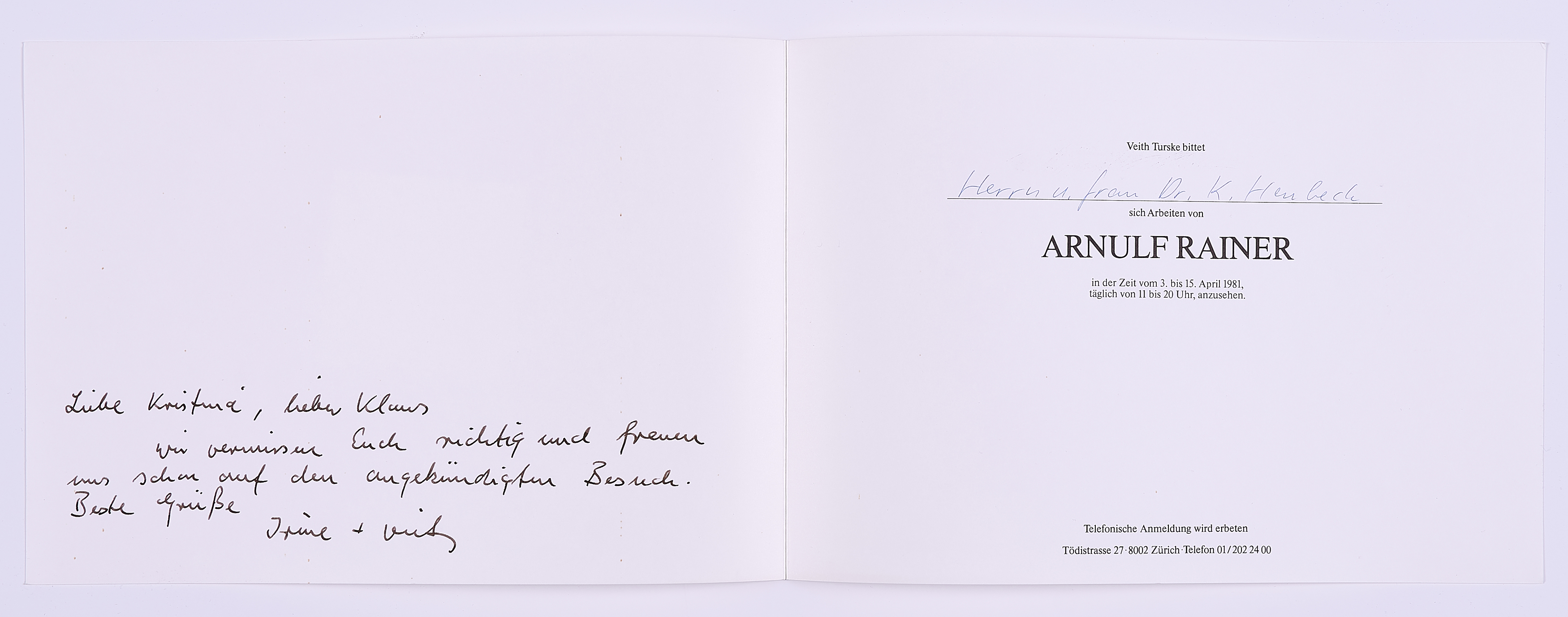 Einladungskarte der Galerie Veith Turske mit persönlichem Einladungstext zu einer Ausstellung mit Werken von Arnulf Rainer im Jahr 1981.