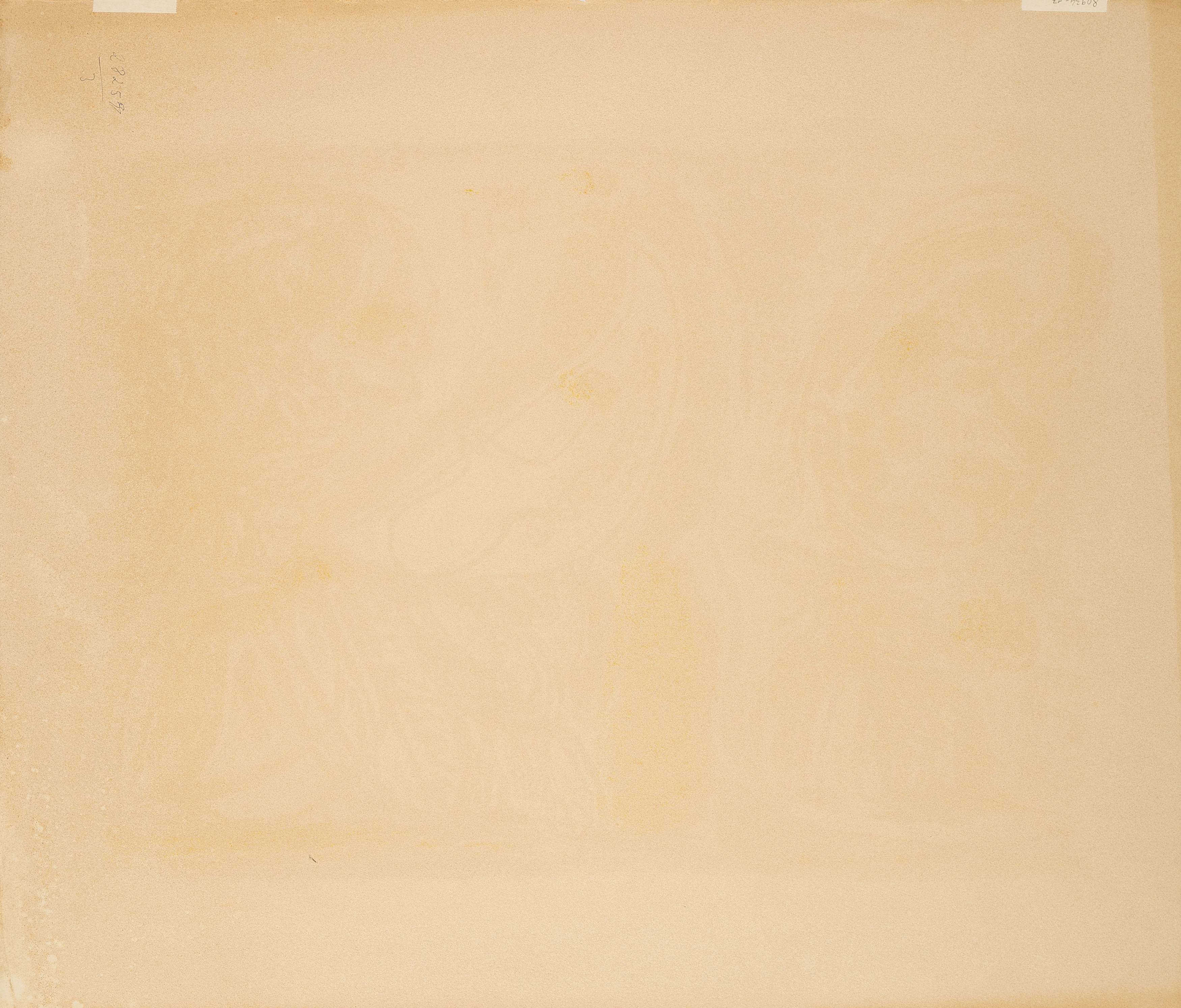Unter dem ehemaligen Passepartoutausschnitt leicht und unregelmäßig gebräunt. Vereinzelt leichte Stockflecken in den Randbereichen. Leichte Knickspuren an der rechten Kante sowie an der linken oberen Ecke. Vereinzelt minimale Fingerabdrücke. Vereinzelt leichte Griffspuren. Verso Reste alter Montierung (schlagen minimal recto durch) sowie unregelmäßig und fleckig gebräunt.