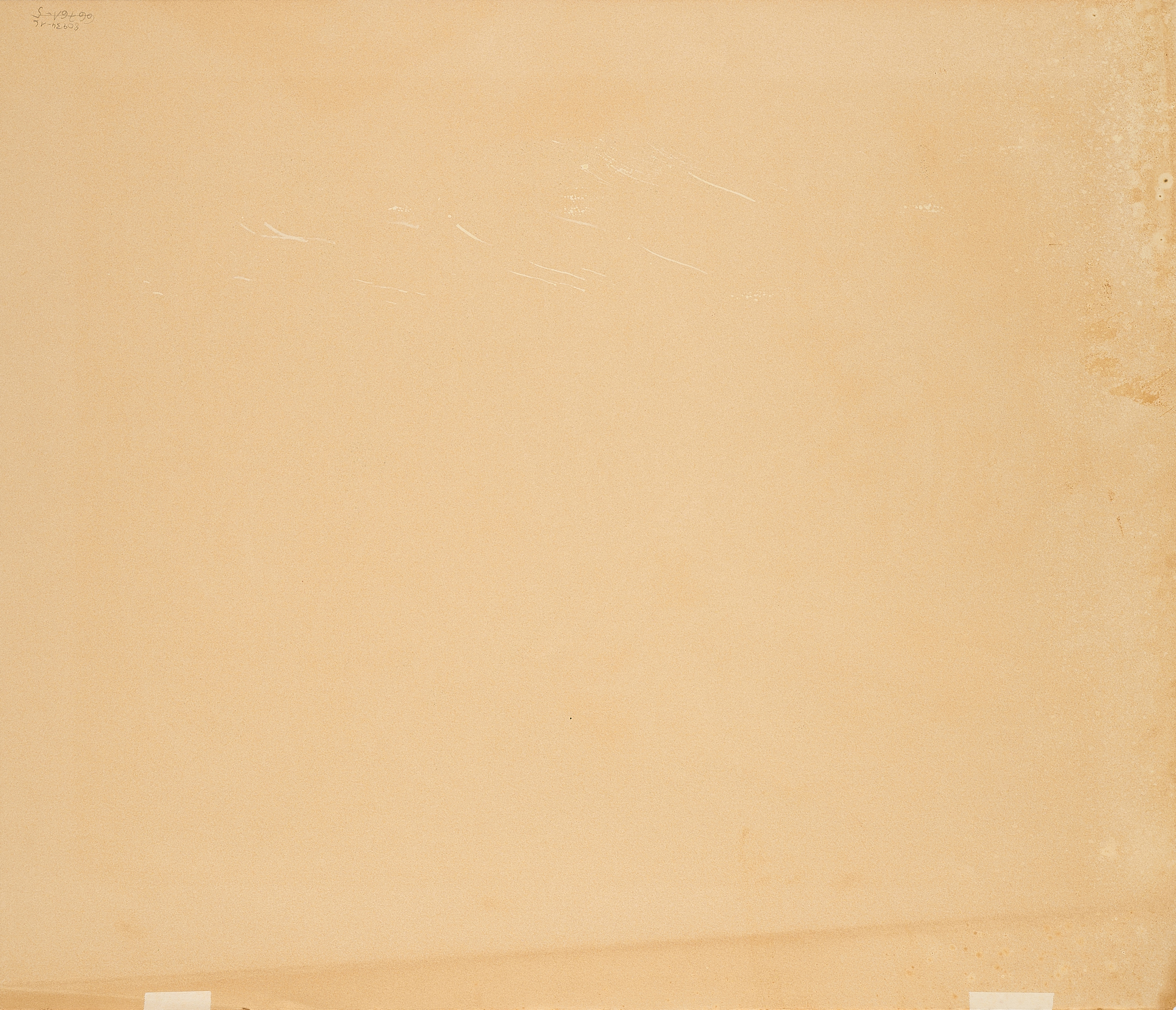 Blatt unregelmäßig gebräunt. Stockflecken in den Randbereichen. Leichte Knickspur am oberen Randbereich links. Leichte Verschmutzungen am linken Randbereich unten. Verso Reste alter Montierung am oberen Randbereich (schlagen minimal recto durch) sowie unregelmäßig und fleckig gebräunt.