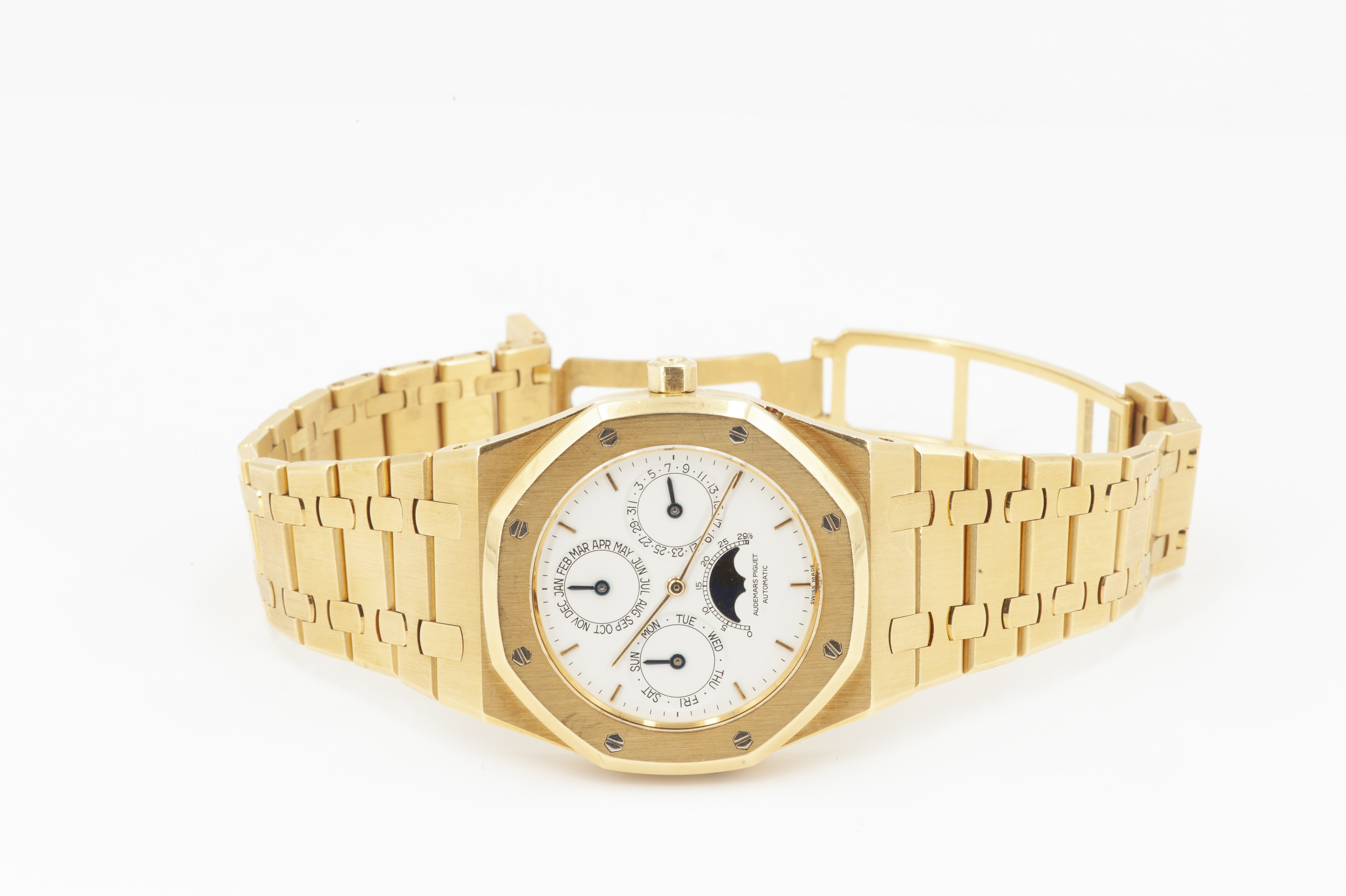 Beschreibung: 2-Zeiger-Armbanduhr mit Ewigem Kalender, Monatsanzeige auf Totalisator bei "12" Uhr, Datumsanzeige auf Totalisator bei "3" Uhr, Mondphase bei "6" Uhr, Wochentagsanzeige auf Totalisator bei "9" Uhr. Automatik-Aufzug mit Schwungmassengewicht aus 21 Karat Gold. Rechnung, Garantie und Revisionsrechnung von 05/2011 anbei.
