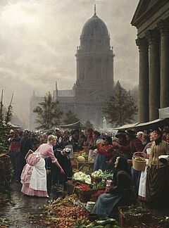 Berlin. Marktreiben auf dem Gendarmenmarkt, im Hintergrund die Kuppel des Französischen Domes. Öl auf Leinwand. 125,5 x 94cm. Signiert und datiert unten links: A. Blunck 87. Rahmen.