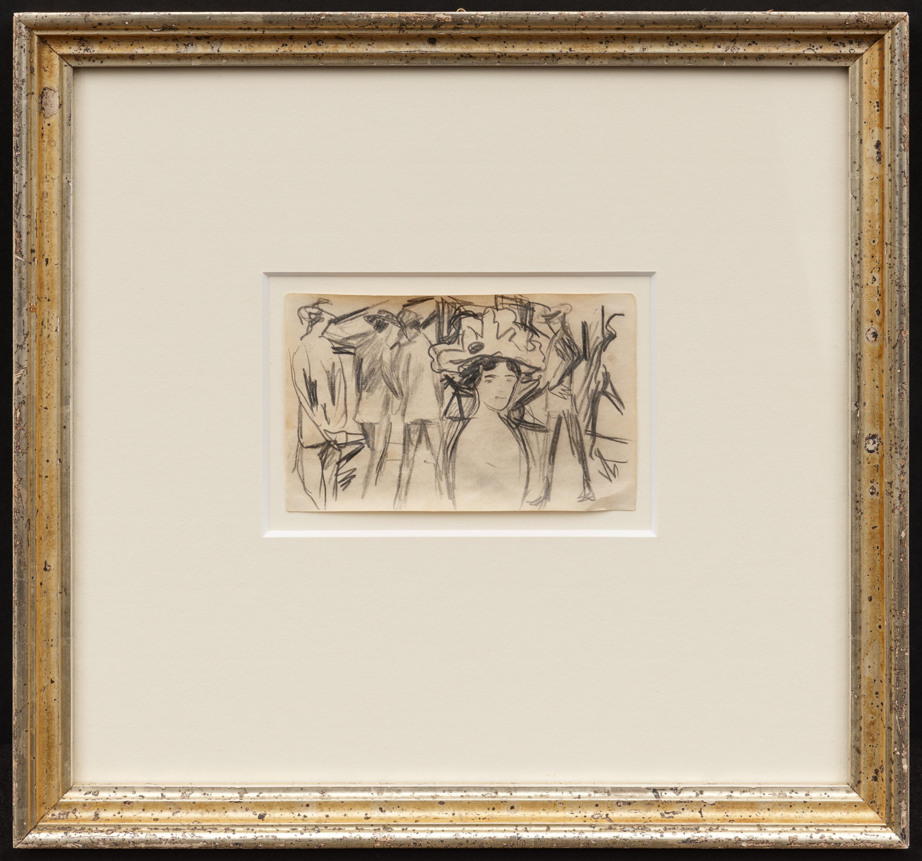 Bezeichnung: Mit dem Nachlassstempel des Künstlers (Lugt 1775b) auf dem beiliegenden Rest der ehemaligen Rahmenrückwand: mit der eingetragenen Nummer BZ 21/19. Hier von Elisabeth Macke bezeichnet: August Macke Dame in der Promenade.