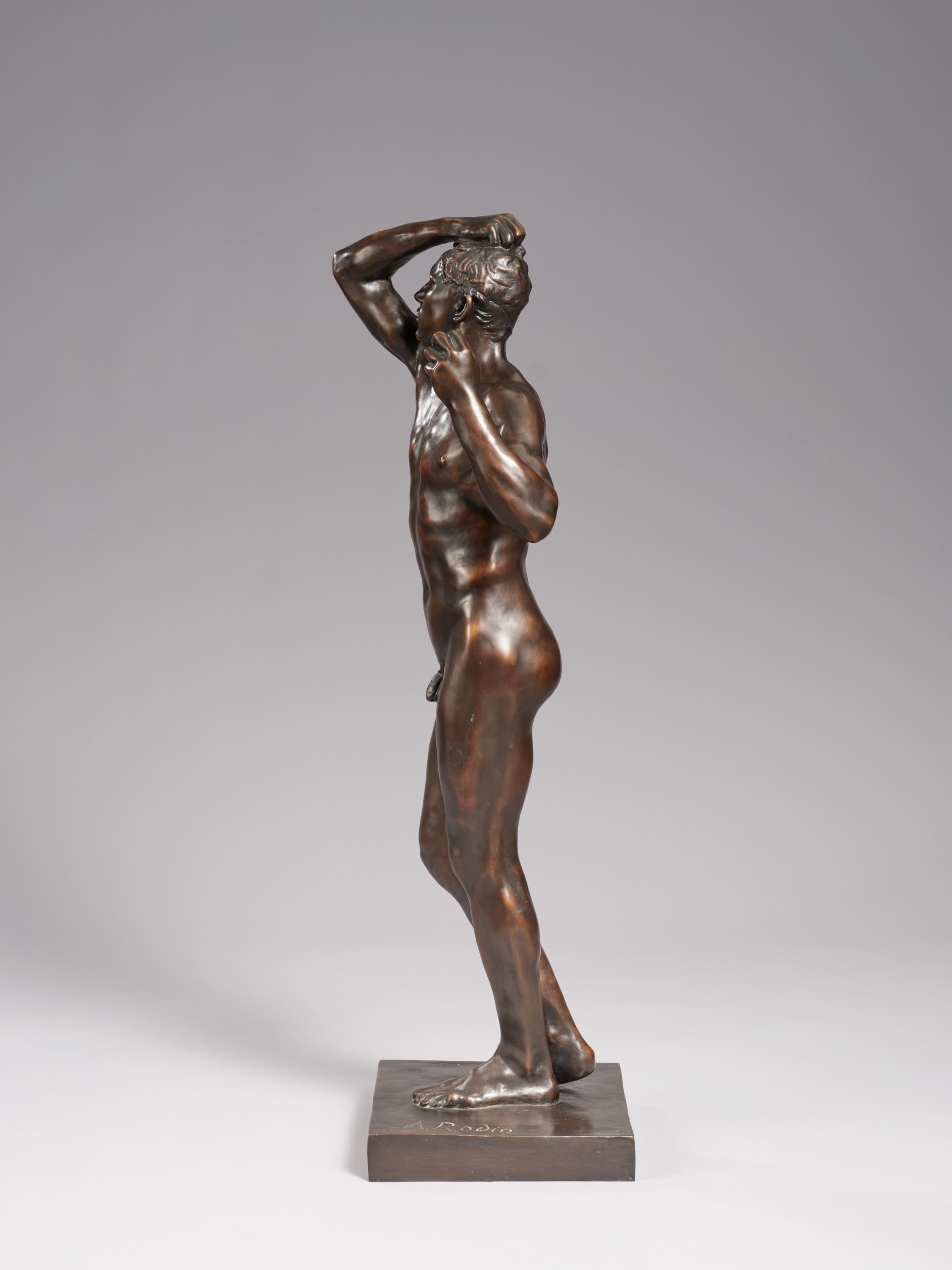 Nachguss nach der 1876 in zwei unterschiedlichen Größen entstandenen Bronze, die sich heute u.a. im Musée d'Orsay in Paris oder der Berliner Alten Nationalgalerie befindet. Das Motiv der lebensgroßen Figur eines nackten Mannes, der ohne jegliche Attribute das Erwachen der Menschheit darstellt, war eine der ersten Arbeiten, mit der der noch junge Rodin seinen Durchbruch erlebte. In ihrer naturgetreuen und detailreichen Umsetzung markiert die Bronze heute den Anfang der modernen Plastik.