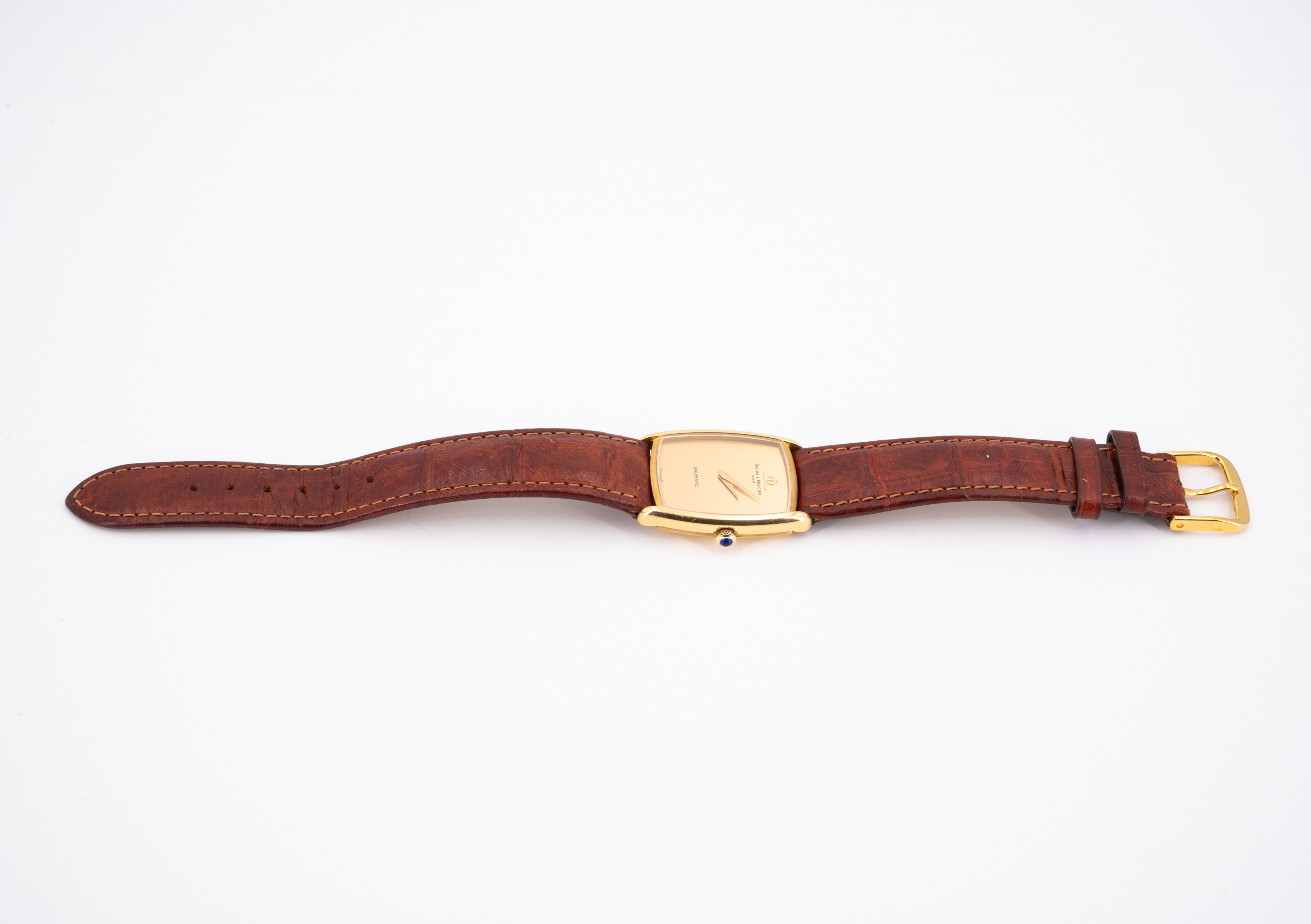Gehäuse/Armband: 750/- Gelbgold, braunes Lederarmband mit Dornschließe, Zffbl. golden, Zeiger golden.