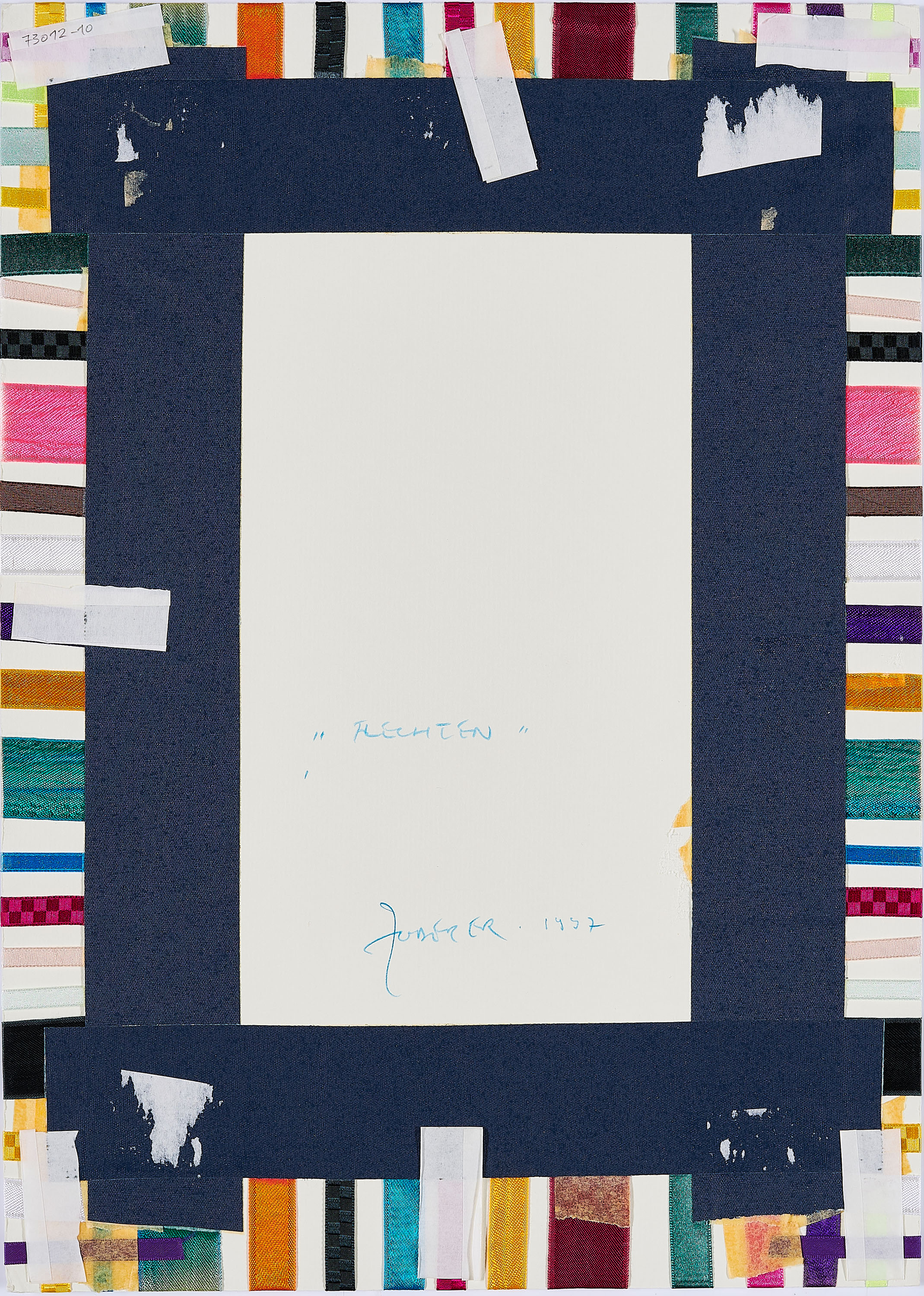 Technik: Textilbänder, verwoben, auf Karton montiert.