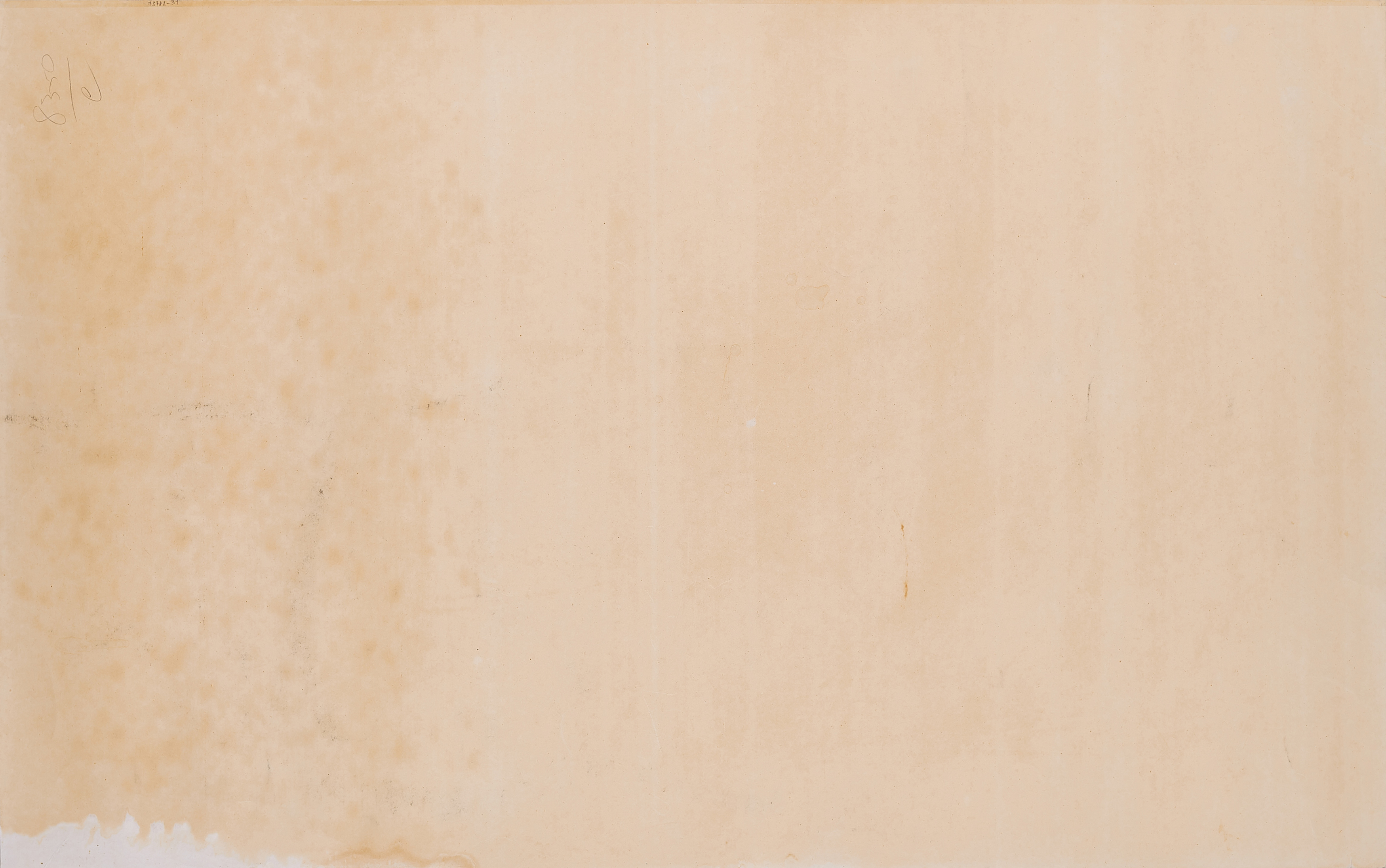 Feuchtigkeitsschaden an der Unterkante, vor allem rechts. Blatt deutlich und unregelmäßig und fleckig gebräunt. Ein Riss (ca. 0,5cm), minimale Bestoßungen, leichte Griffspuren und Stecknadellöcher in den Randbereichen. Verso Reste alter Montierung sowie deutlich gebräunt und leichte Verschmutzungen.