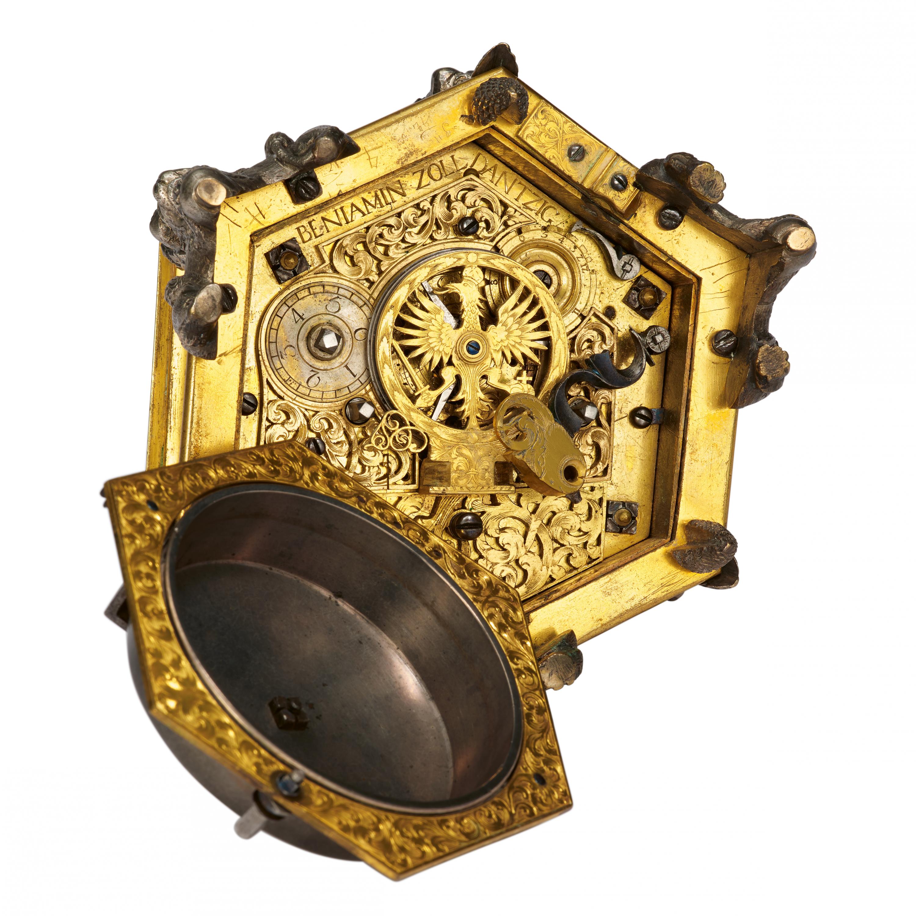 Auf der Oberseite, unterhalb der XII bez. "Benjamin Zoll". Auf Rückplatine bez. "BENIAMIN ZOLL DANTZIG" (tätig 1734-1759, Abeler S.619).