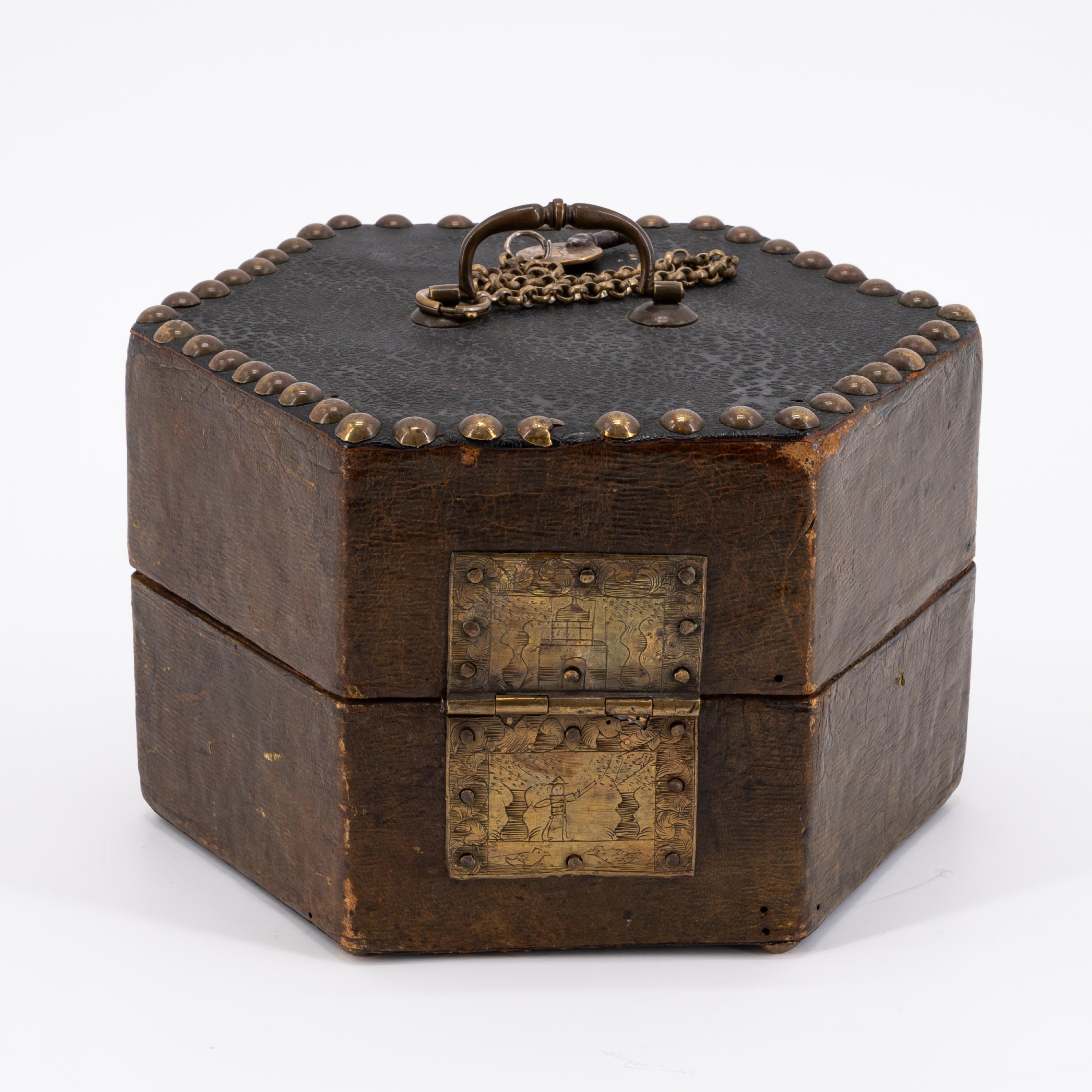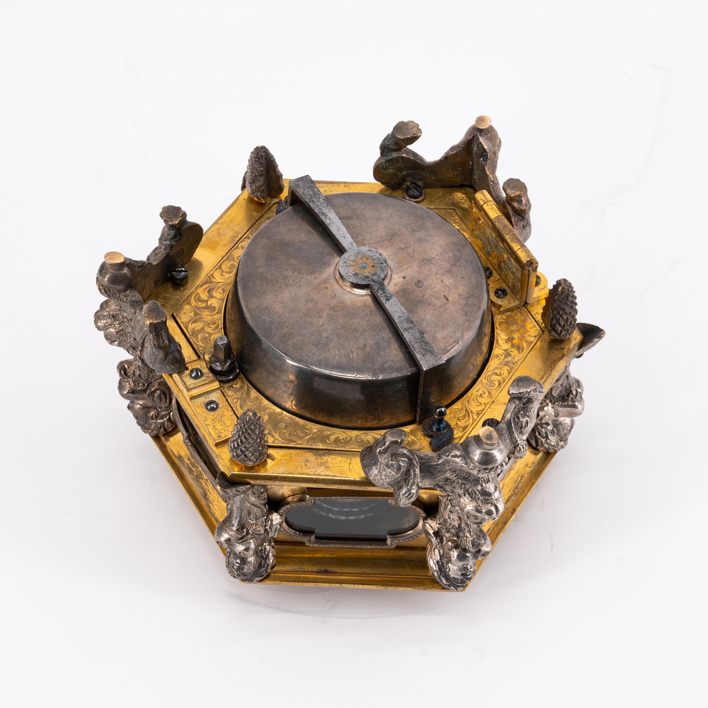 Beschreibung: Das Futteral mit Ziernägeln entlang des oberen Randes und gravierten Scharnier- und Schlossbeschlägen. Hexagonales Gehäuse auf drei Füßen in Form versilberter Löwen, zwischen ihnen herbhängende Zapfen. Die Seiten je mit verglasten, medaillonförmigen Durchfensterungen. Auf den Ecken weibliche Büsten auf Akanthuskonsolen. Versilbertes, breites Ringzifferblatt mit römischen Stunden und arabischer Minuterie auf fein graviertem Grund. Die gebläuten Stahlzeiger fein durchbrochen und graviert.