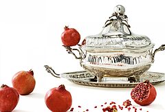 PRÄCHTIGE ROKOKO TERRINE MIT GRANATAPFELKNAUF AUF PRÉSENTOIR.