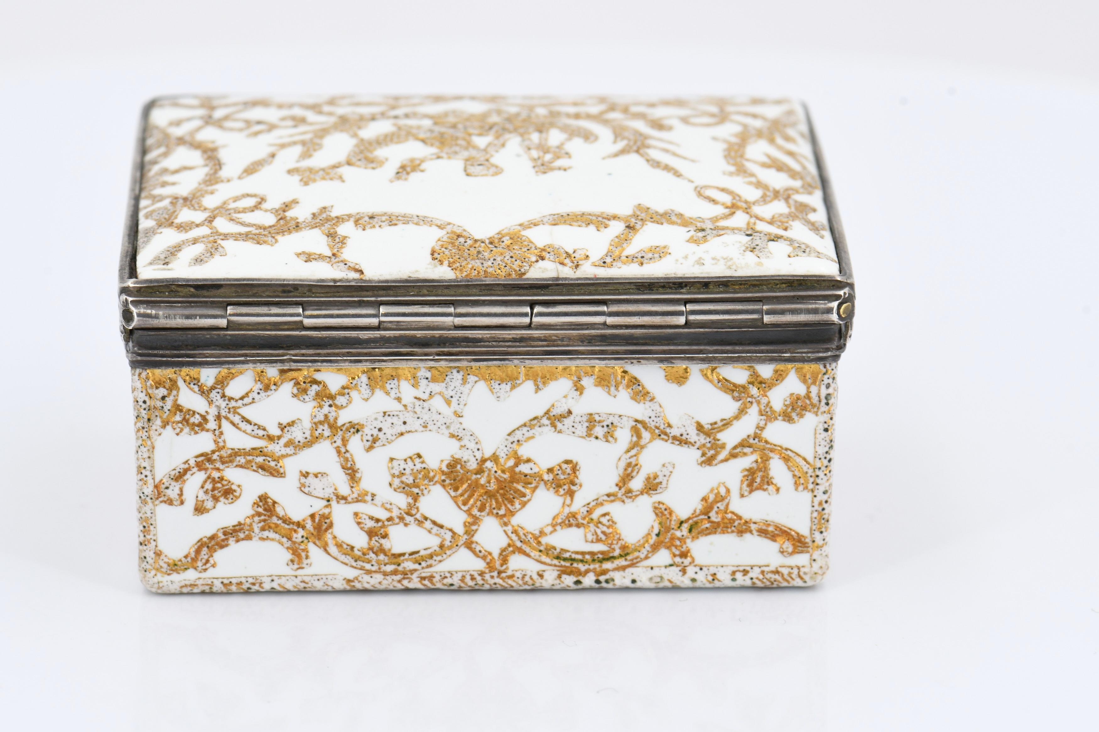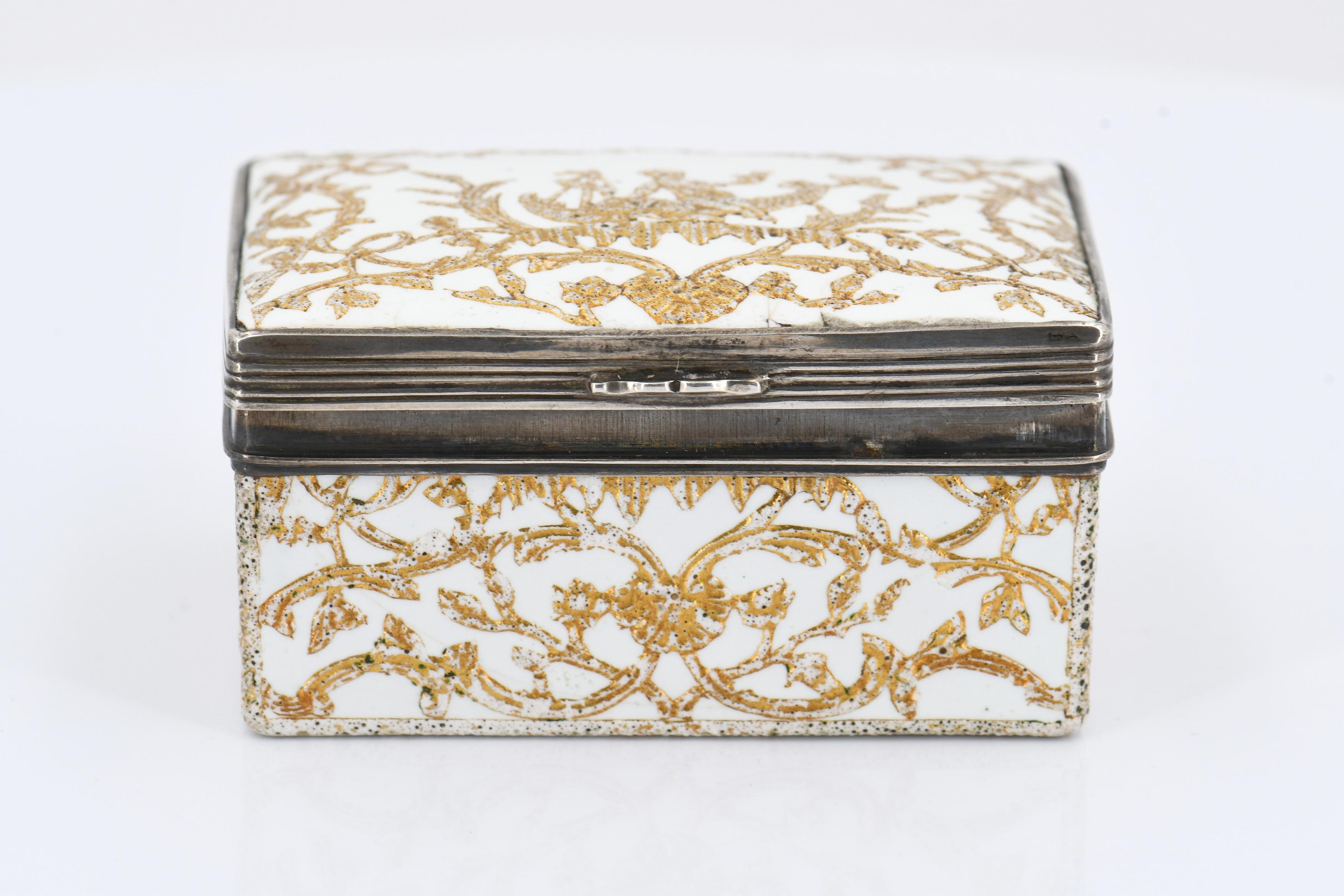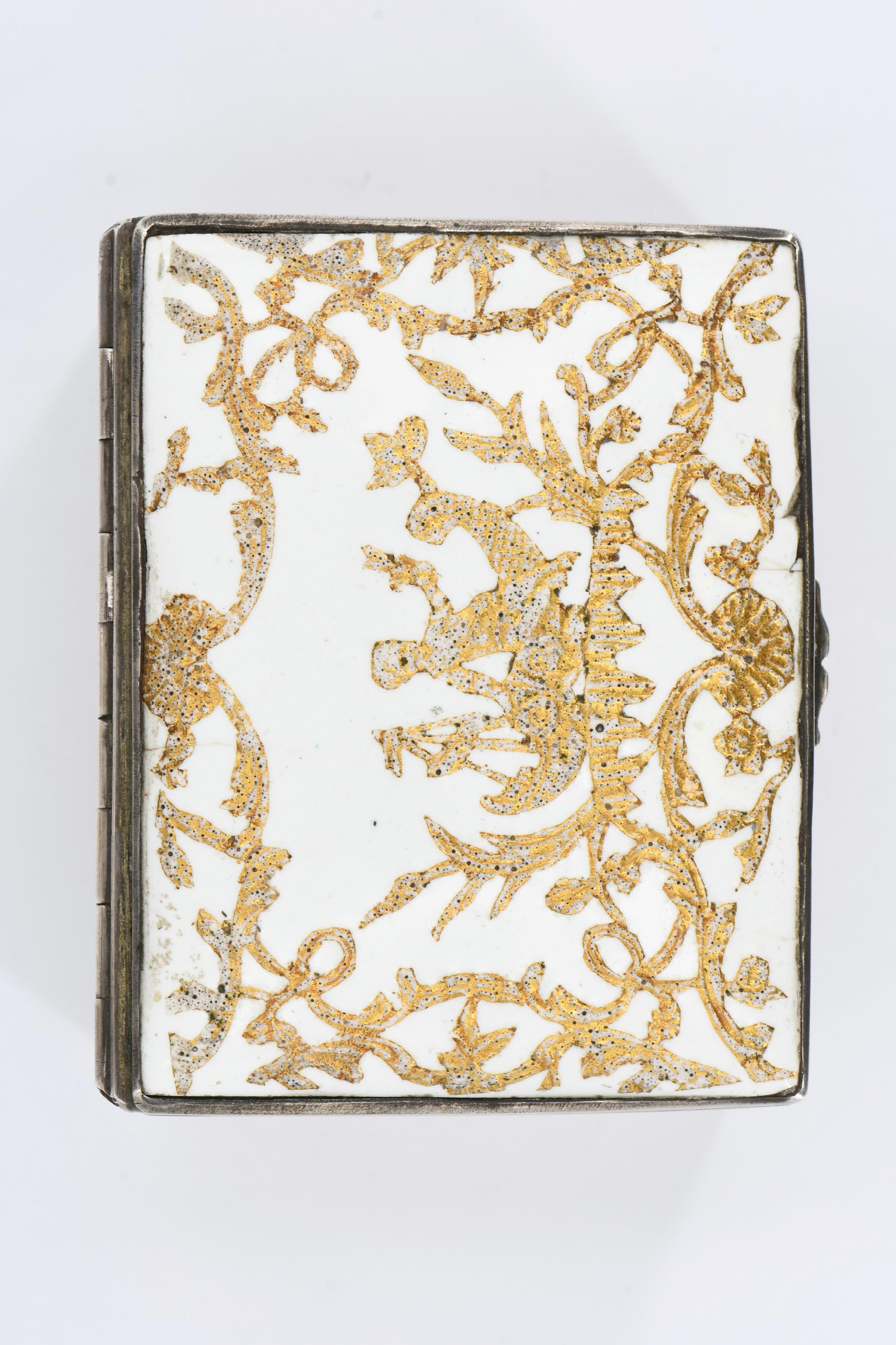 Technik: Weißes Emaildekor mit Goldrelief. Silbermontierung.