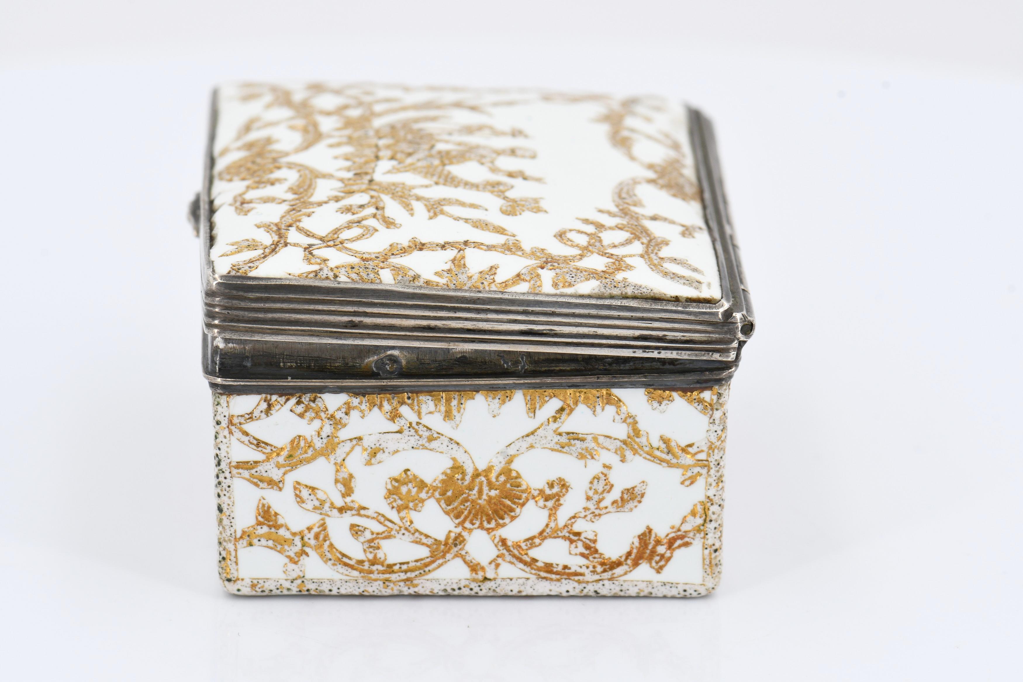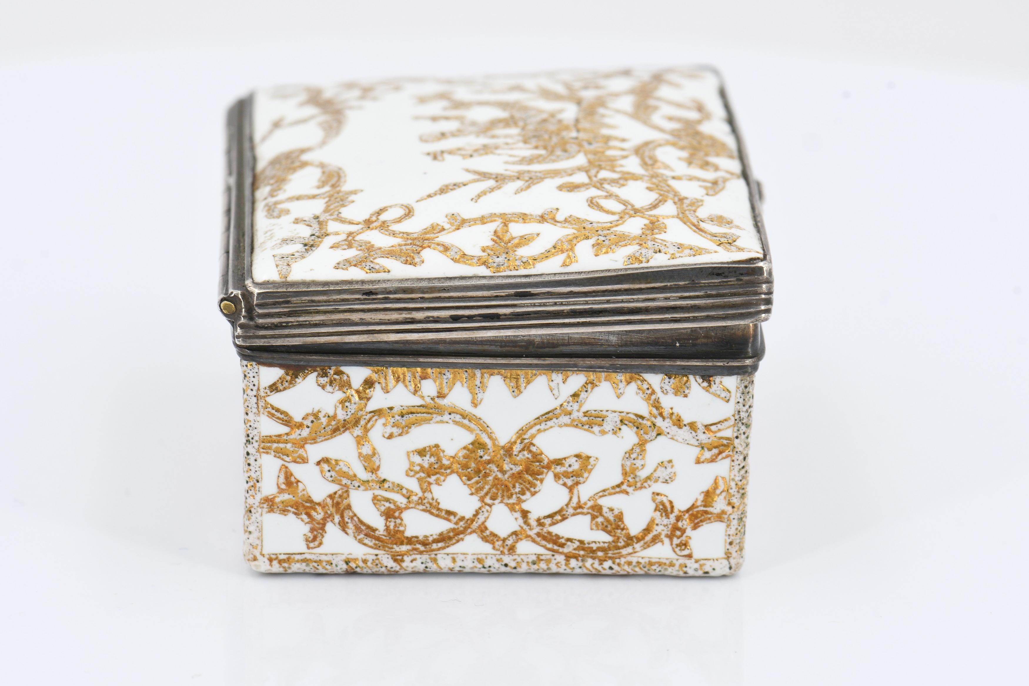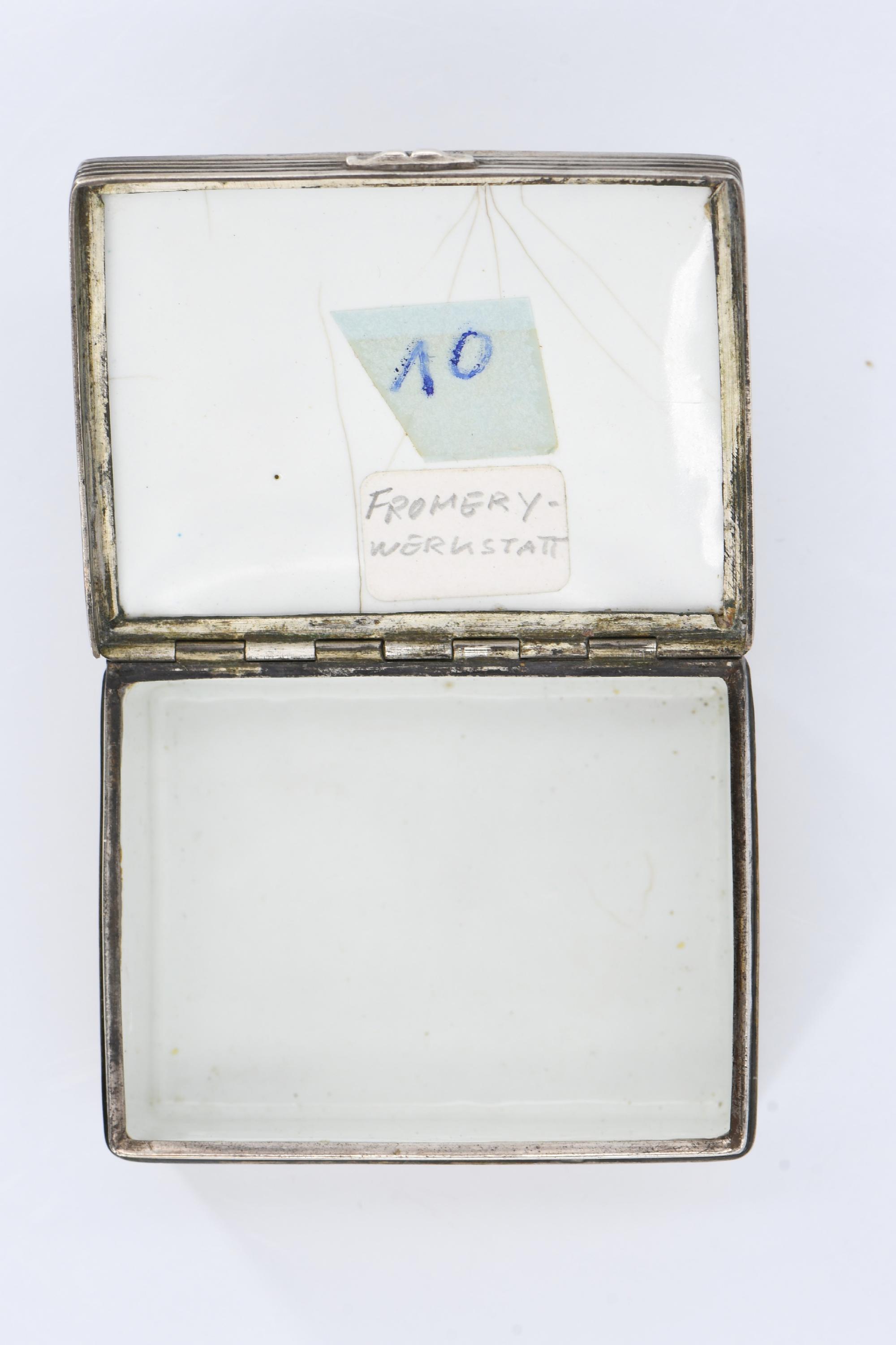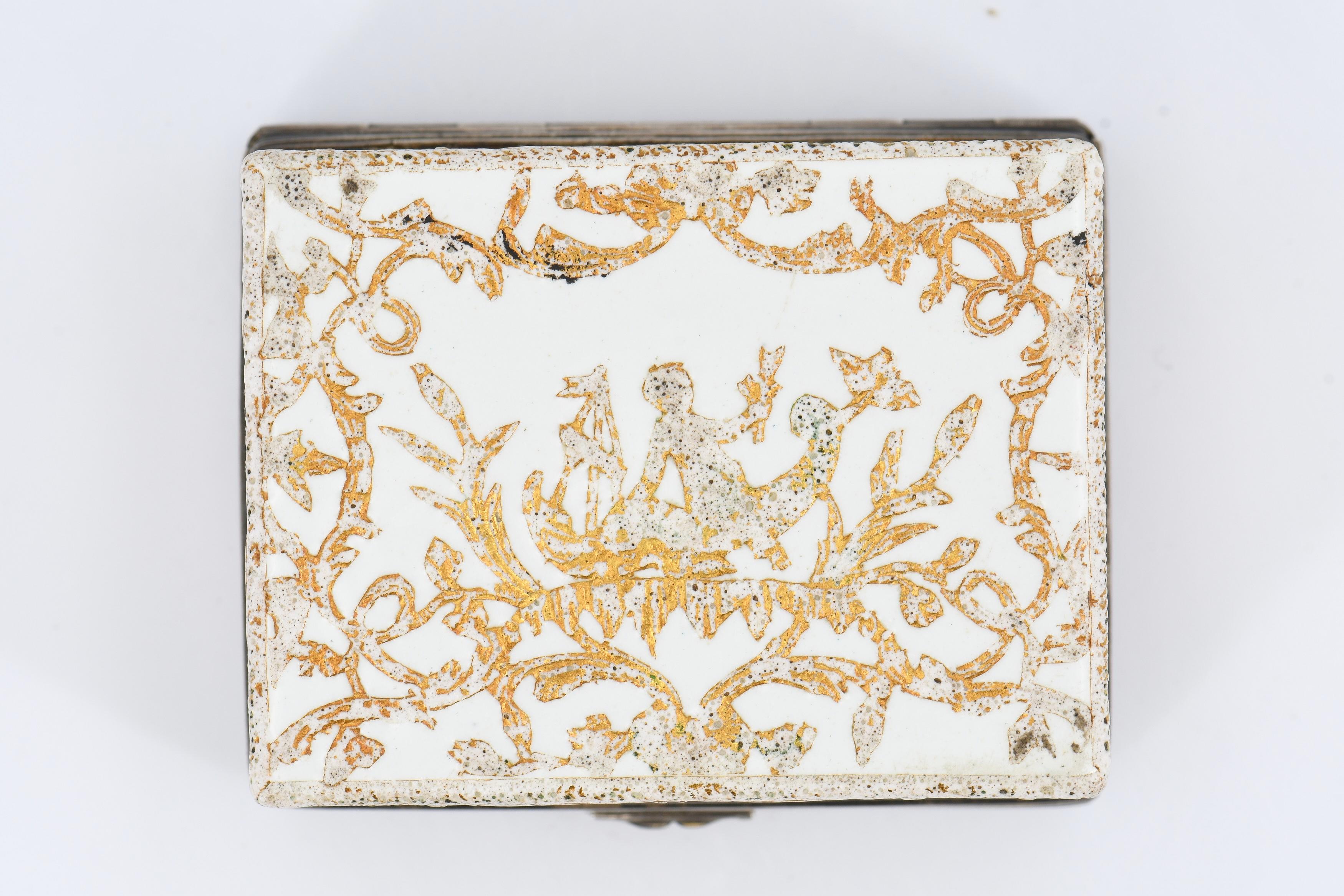 Technik: Weißes Emaildekor mit Goldrelief. Silbermontierung.