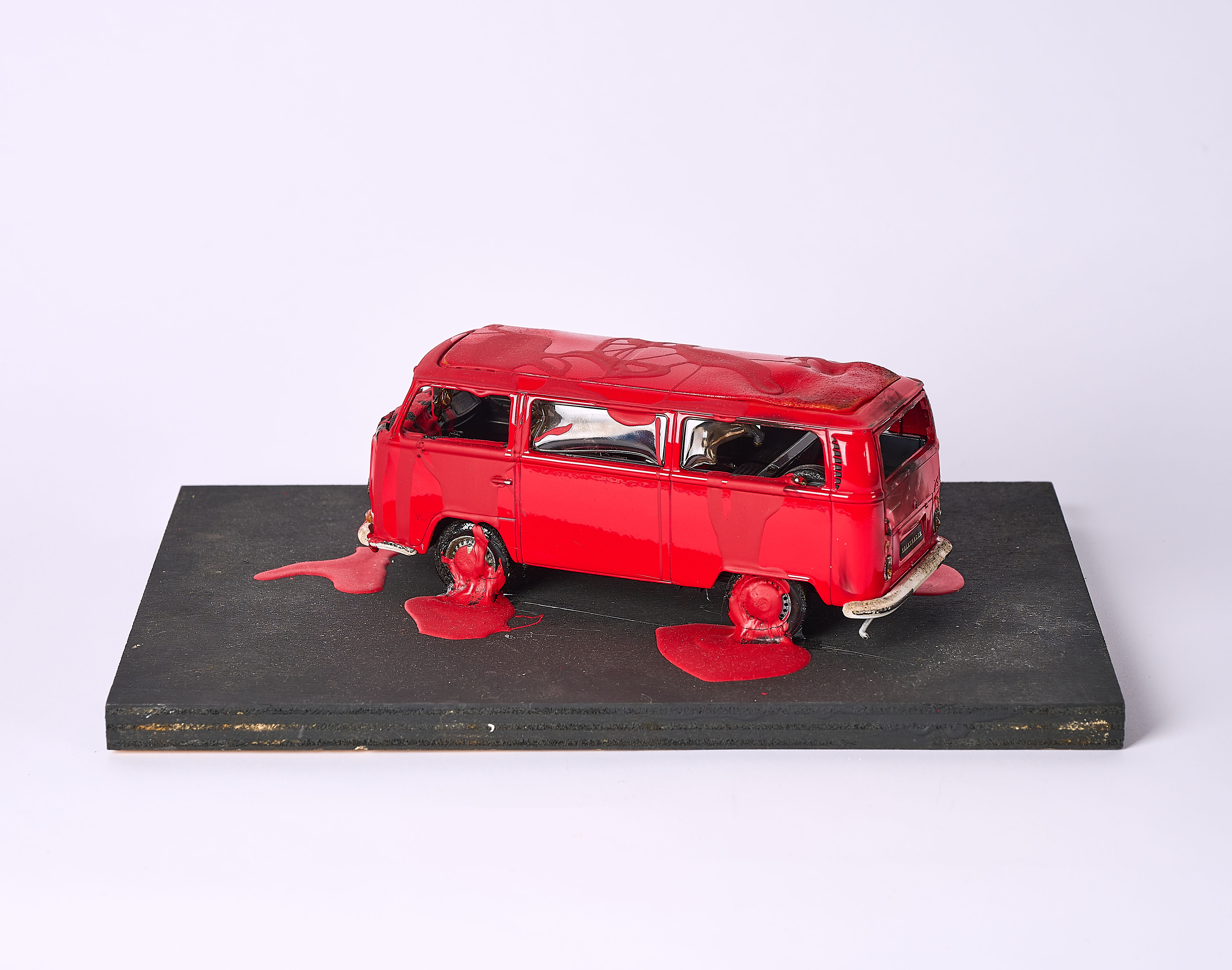 Technik: Mit Farbe übergossener Spielzeugbus auf farbig gefasster Holzplatte.