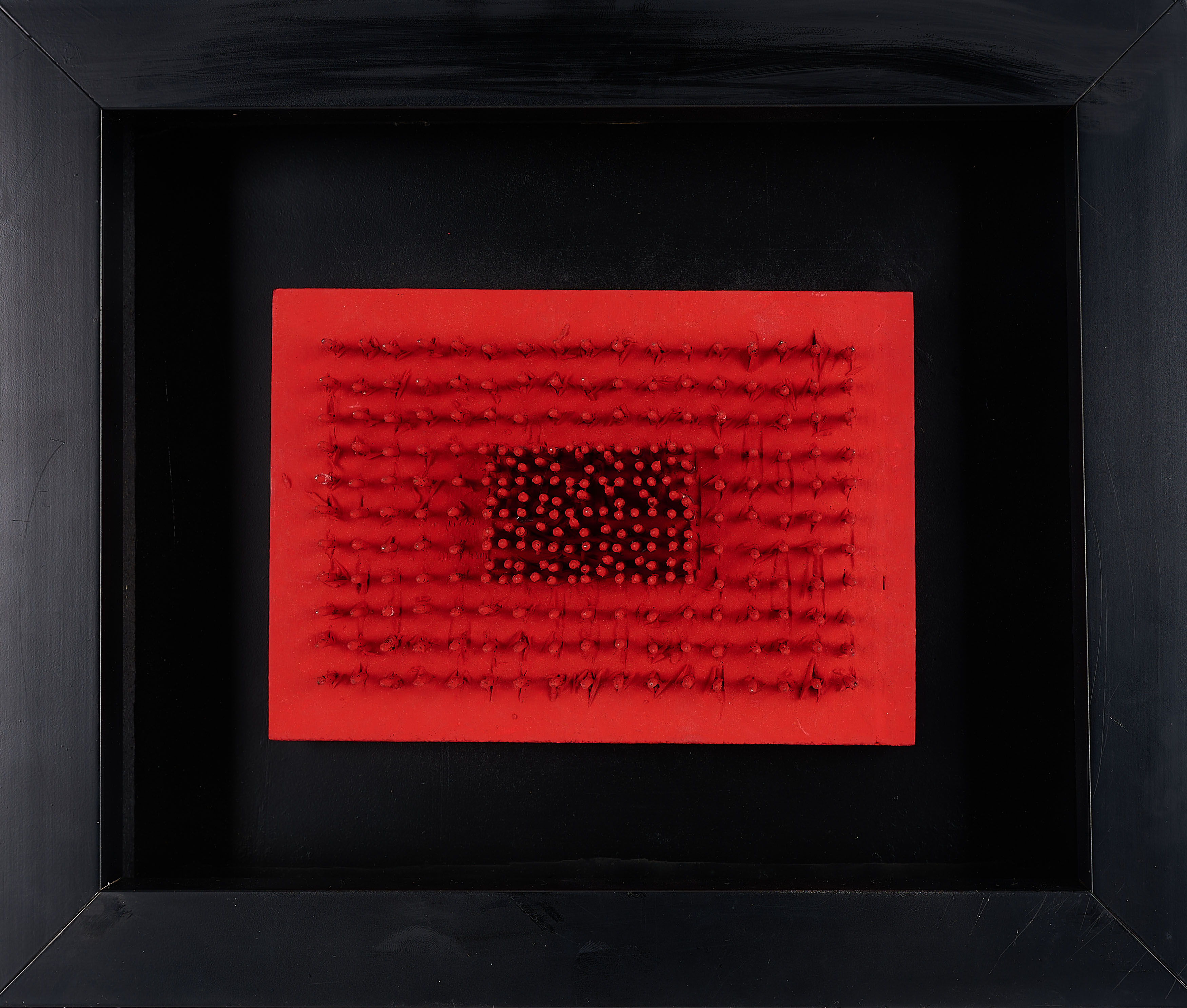 Technik: Nägel in Holzplatte, farbig gefasst.