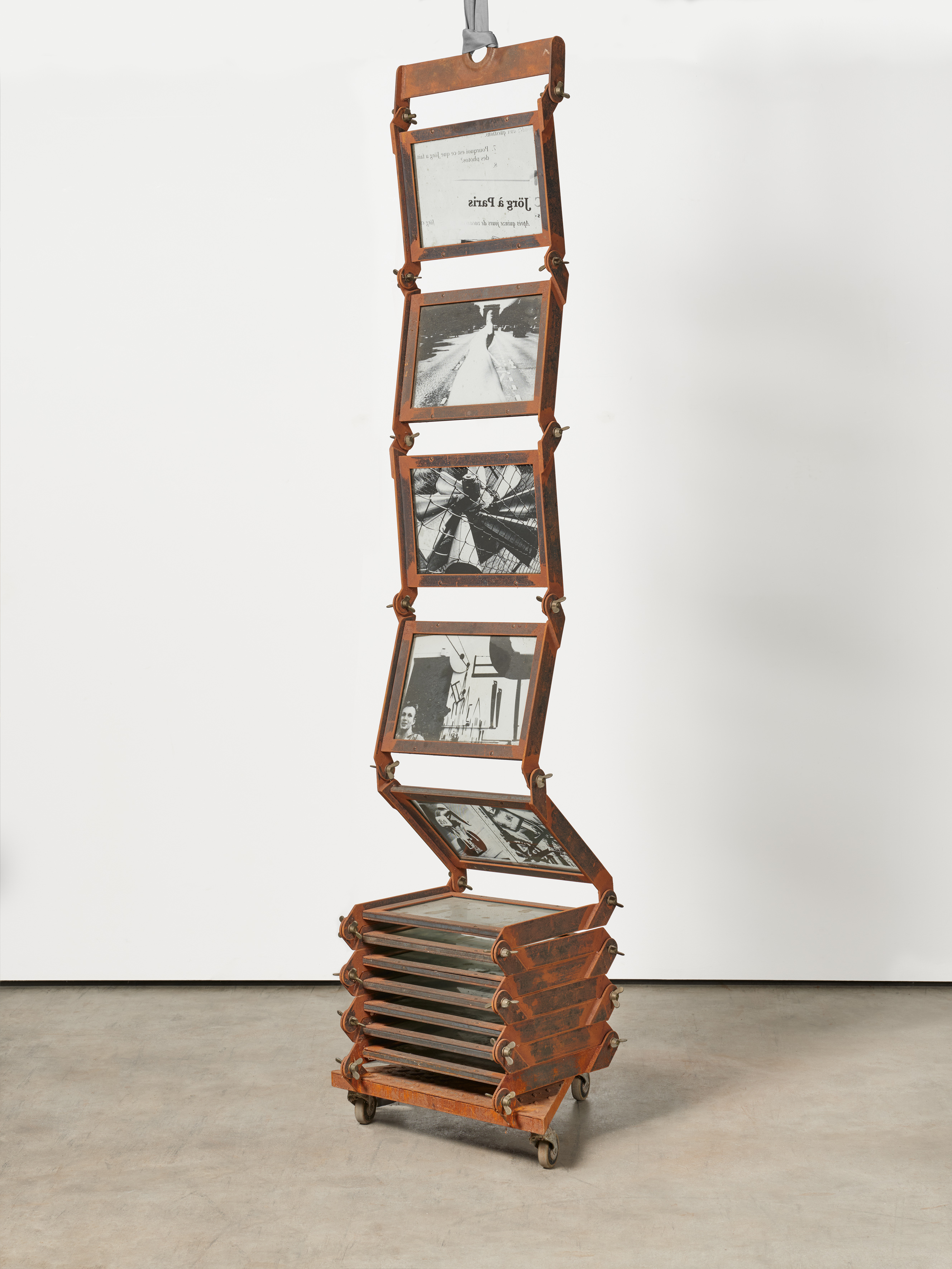 Technik: Stahlrahmen mit 12 bedruckten Glasscheiben auf Rollbrett.