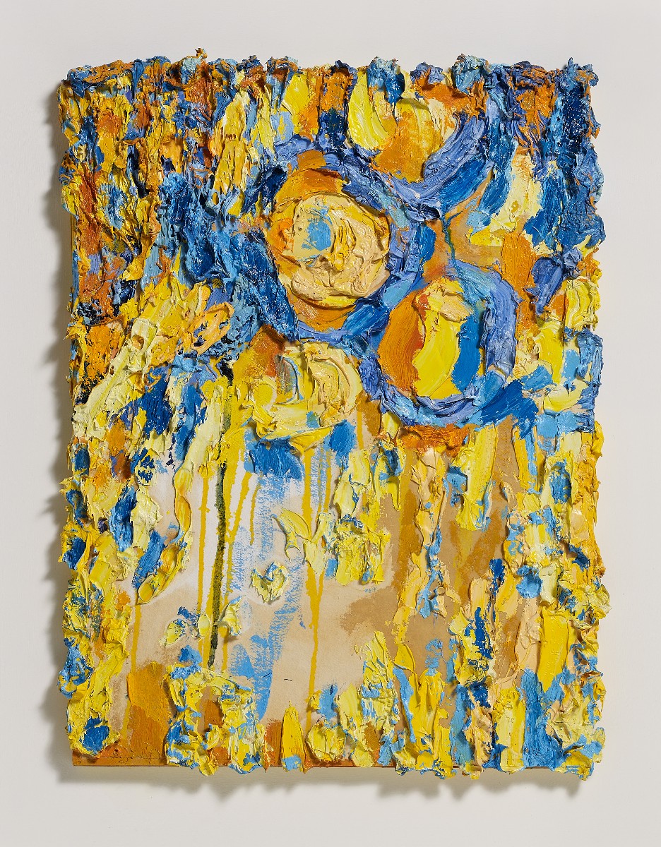 "Europäisches Blumenbild (Gold-Blau)". Öl auf Holz auf Keilrahmen. 81 x 62cm. Signiert und betitelt rückseitig: Bernd Schwarzer, Europäisches Blumenbild (Gold-Blau). Nochmals signiert. Rahmen.
