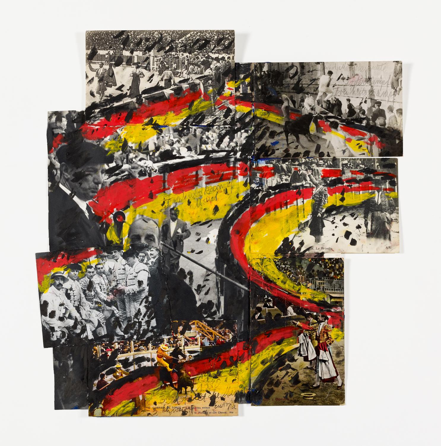 "Freiheitskampf Todeskampf Stierkampf Tier und Menschenrechte Bald fällt die Mauer Europa". 1984 - 88 - 90. Ölkreide auf Foto auf Fotokarton. 36 x 45cm. Signiert, betitelt und datiert in Bleistift recto: "Freiheitskampf Todeskampf Stierkampf Tier und Menschenrechte Bald fällt die Mauer Europa". Rahmen.