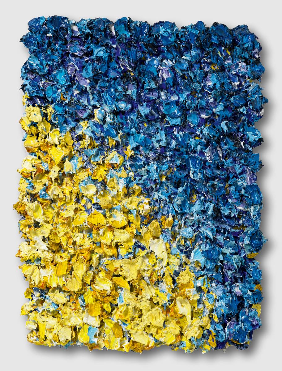 "Europäischer Vulkan (Flammenbild) (Gold-Blau). Öl auf Büttenpapier auf Leinwand. Ca. 77 x 58cm. Mehrfach signiert, betitelt und mit Werkangaben versehen verso: Bernd Schwarzer Europäischer Vulkan (Flammenbild) (-Gold-Blau) Büttenpapier auf Leinwand BM. Modellrahmen.