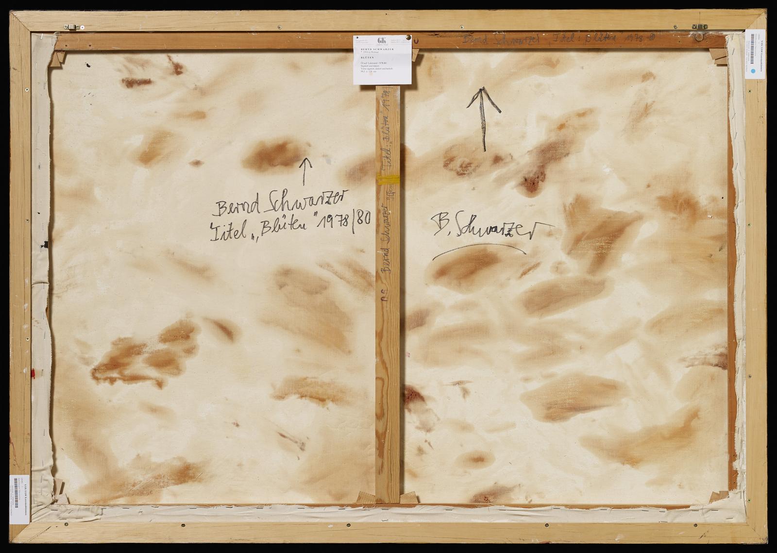 "Blüten". 1978/1980. Öl auf Nessel. 90 x 130cm. Signiert und datiert unten Mitte: B. Schwarzer 78-80. Signiert, betitelt, datiert verso auf Leinwand und Keilrahmen: Bernd Schwarzer, Titel: 'Blüten', 1978/80. Nochmals signiert auf Leinwand B. Schwarzer (unterstrichen). Modellrahmen.
