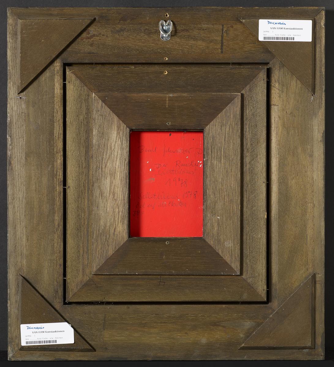 "Der Raucher - Selbstbildnis". 1978. Öl auf Malkarton. 24,5 x 18,5cm. Signiert, betitelt und datiert verso: Bernd Schwarzer, 'Der Raucher' 'Selbstbildnis' 1978. Modellrahmen.