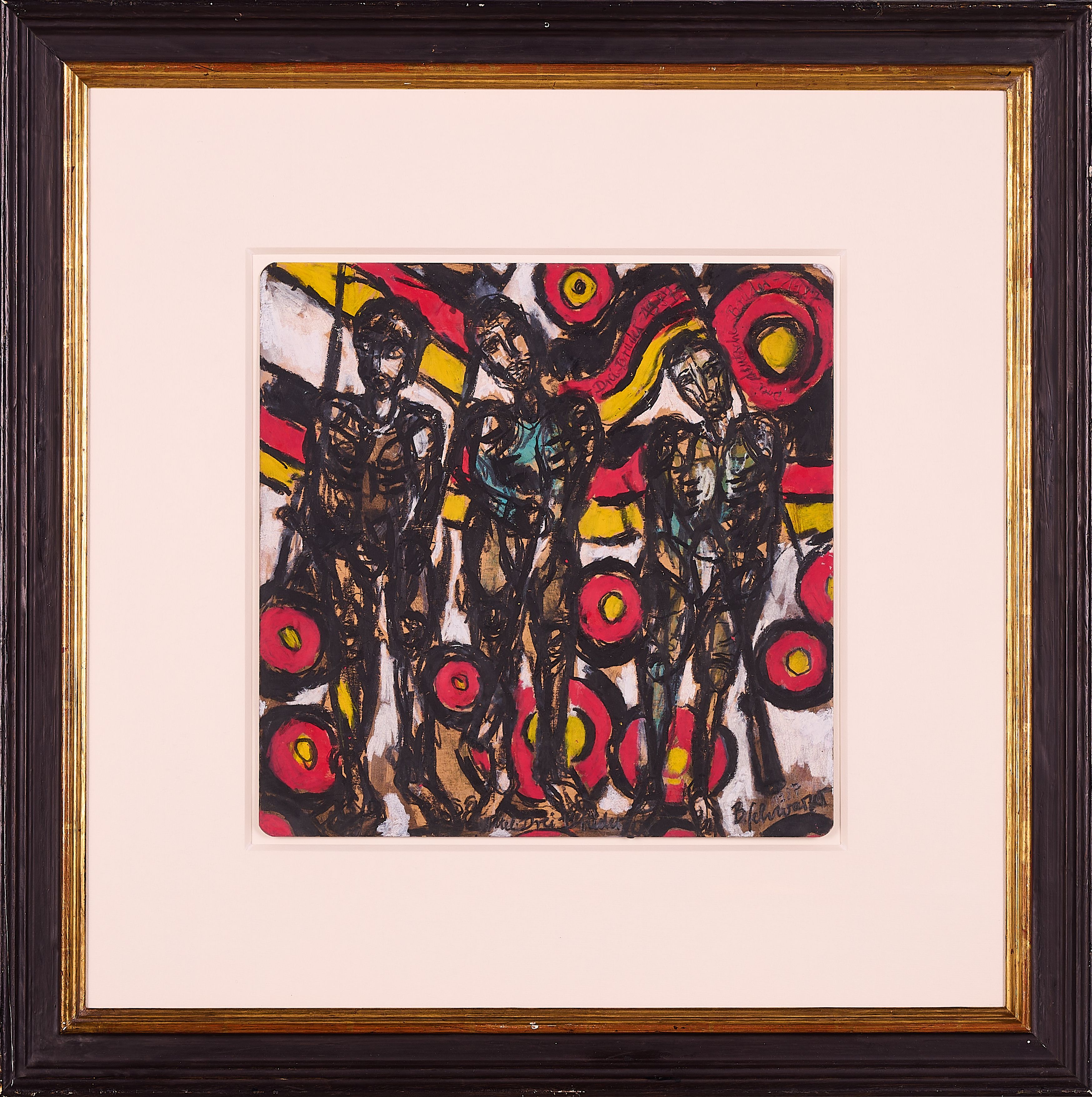 Bezeichnung: Betitelt und datiert oben: Drei Brüder 1987 Drei deutsche Brüder 1987. Sowie betitelt, signiert und datiert unten: Titel: Drei Brüder B. Schwarzer 1987. Signiert, betitelt und datiert verso (mehrmals) und auf der Rahmenrückwand.