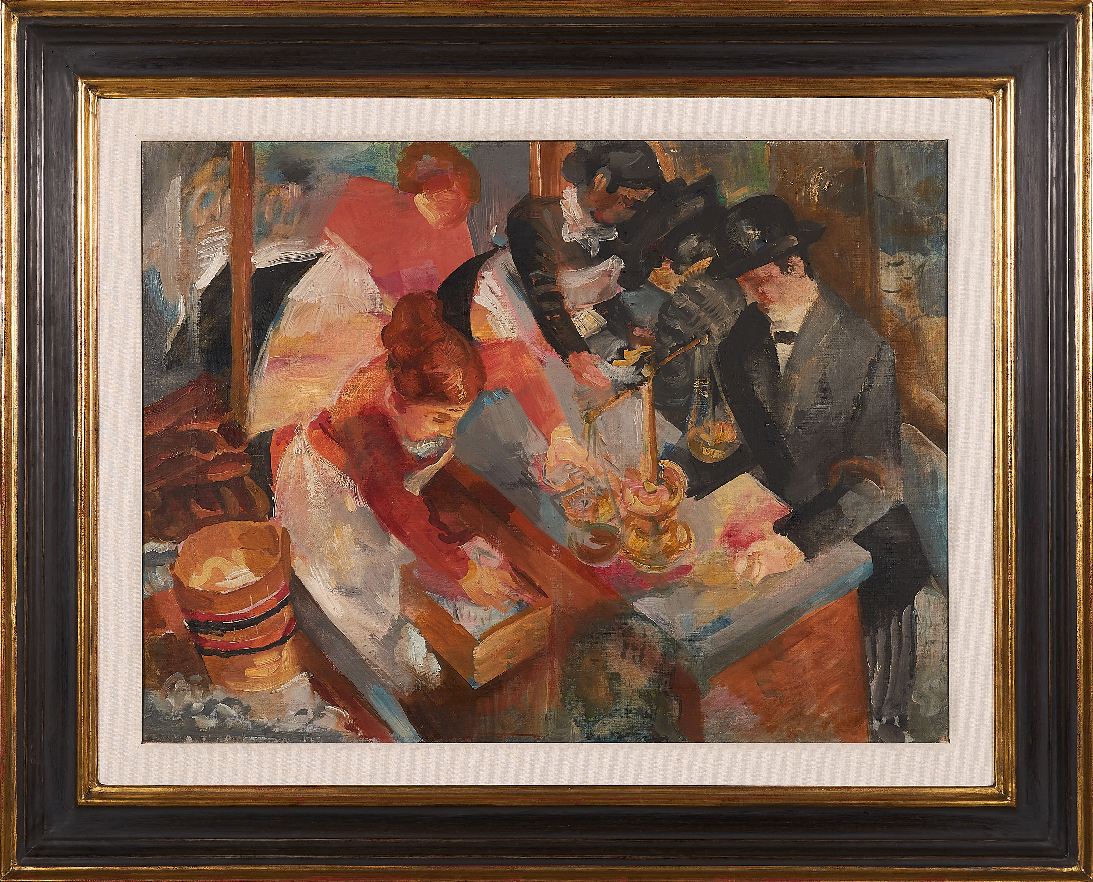 Unter UV-Licht erkennbare Retuschen in der unteren rechten Ecke und im unteren Bildbereich, sowie im linken Randbereich. Eine leichte Delle in der Leinwand am unteren Rand mittig sowie am linken Rand unten. Kleine Farbabplatzung im pastosen Bereich am unteren Rand rechts (ca. 0,2 x 0,3cm) sowie mittig im Bereich der Waage (ca. 0,2 x 0,2cm). Strichförmige Bereibungen mit minimalem Krakelee, parallel zu den Kanten. Ansonsten guter Zustand. Im Rahmen beschrieben