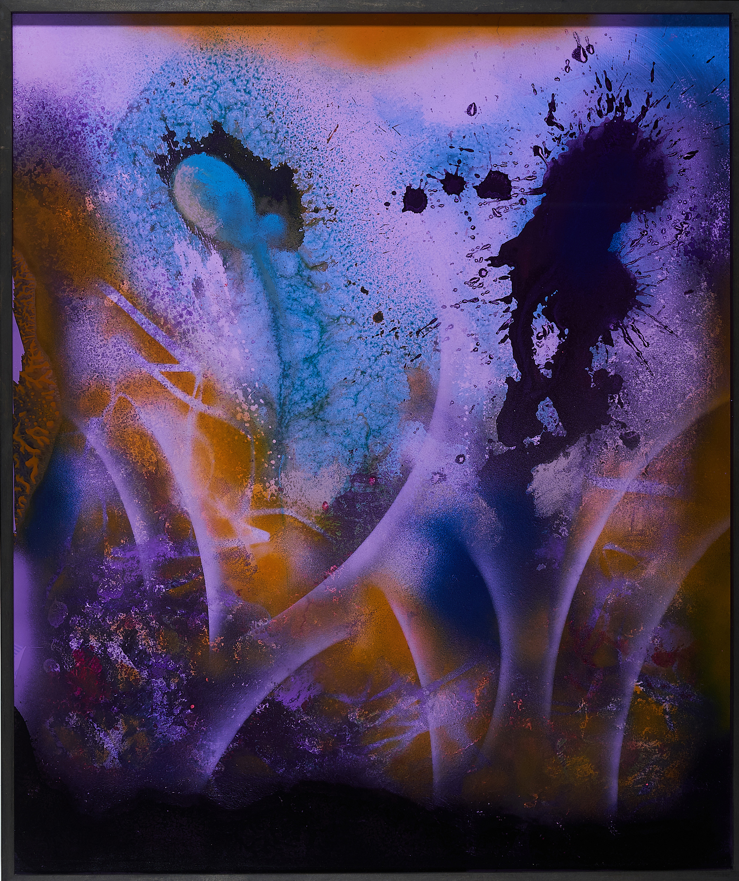 Technik: Sprühfarbe auf Plexiglasscheibe vor HDK mit Sprühfarbe und Tusche.