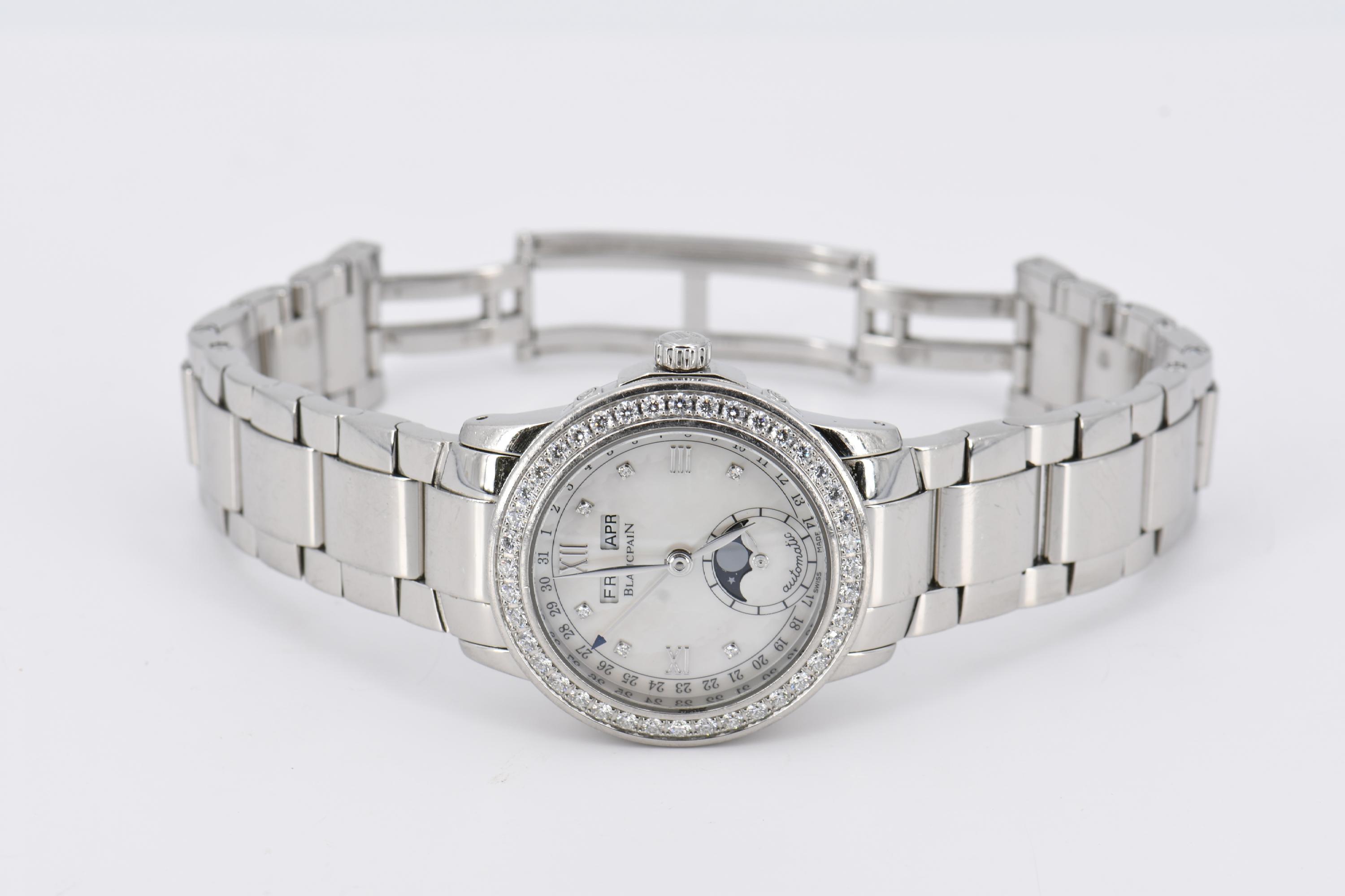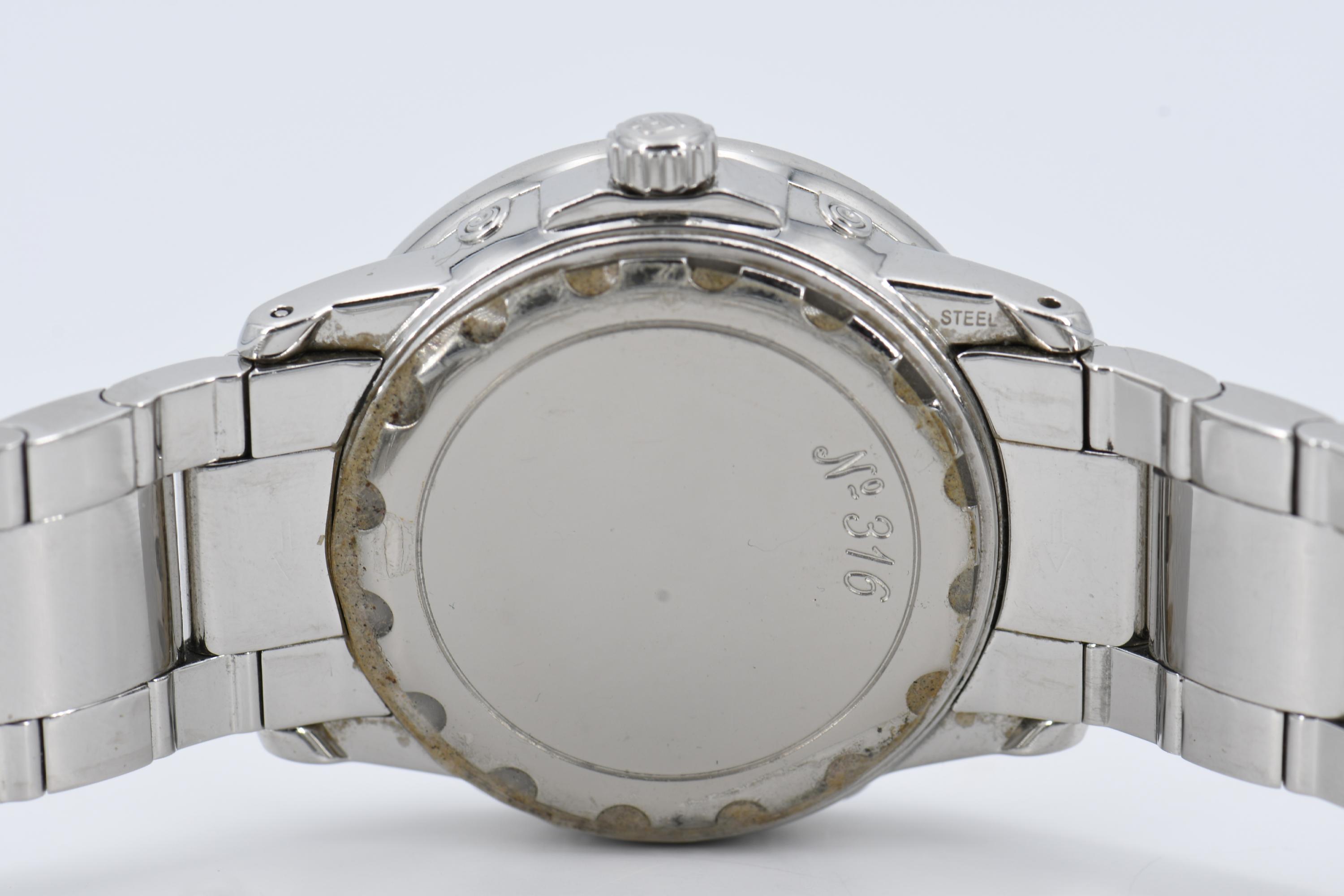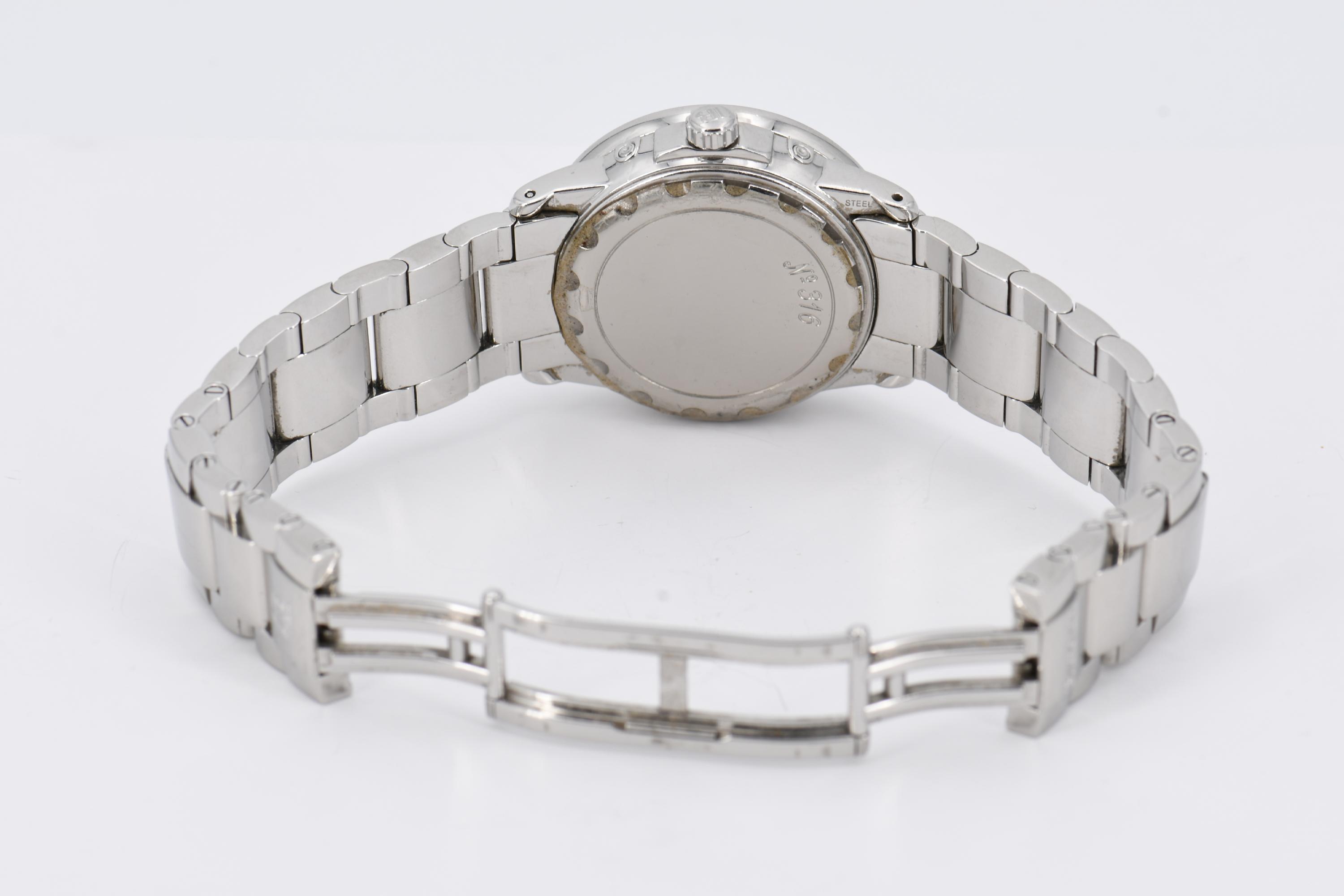 Gehäuse/Armband: Stahl, poliert, Zffbl. Perlmutt, Lünette und Indizes diamantgeziert, Zeiger silbern.