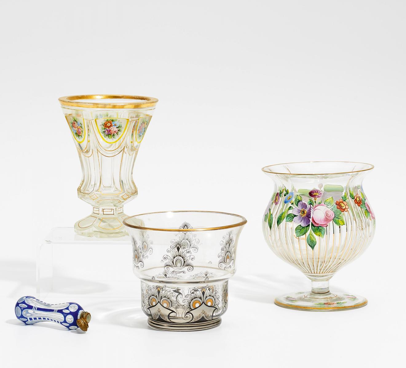 Technik: Farbloses Glas tlw. farbig dekoriert. Verschiedene Dekore.