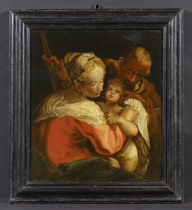Die Heilige Familie. Öl auf Holz. Parkettiert. 69 x 61cm. Rahmen.