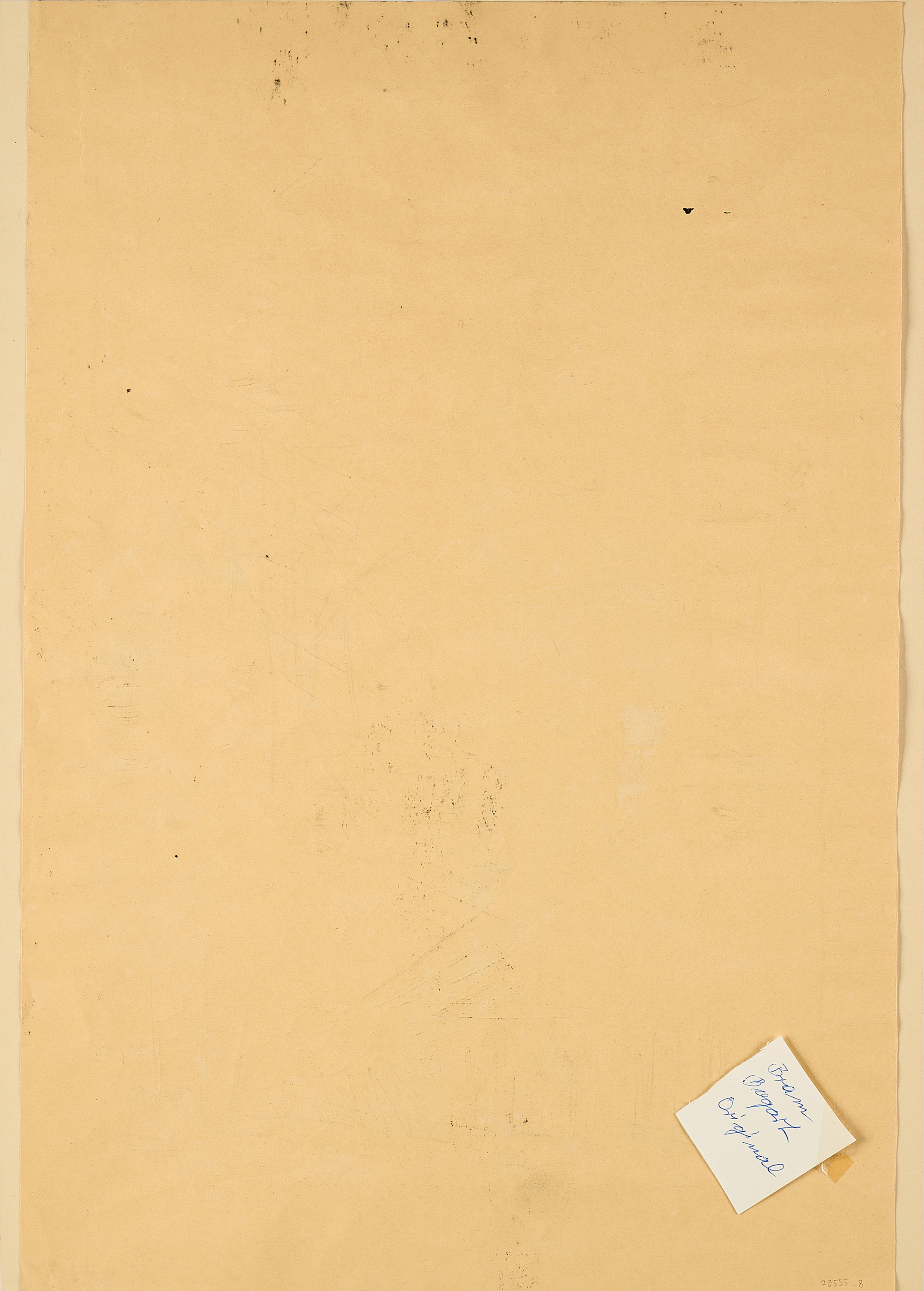 Herstellungsbedingt minimal gewellt. Leicht gebräunt. Minimale Knickspuren, vereinzelt leichte Knickspuren. Minimale Bestoßung an einer Kante. An zwei Stellen oben und unten in das Passepartout montiert. Passepartoutkanten minimal unregelmäßig. Passepartout leicht gebräunt mit leichten Bräunungsflecken und einem Zirkelloch. Verso leicht gebräunt sowie leichte Verschmutzungen und mit Klebeband aufgeklebter Zettel. Ansonsten guter Zustand.