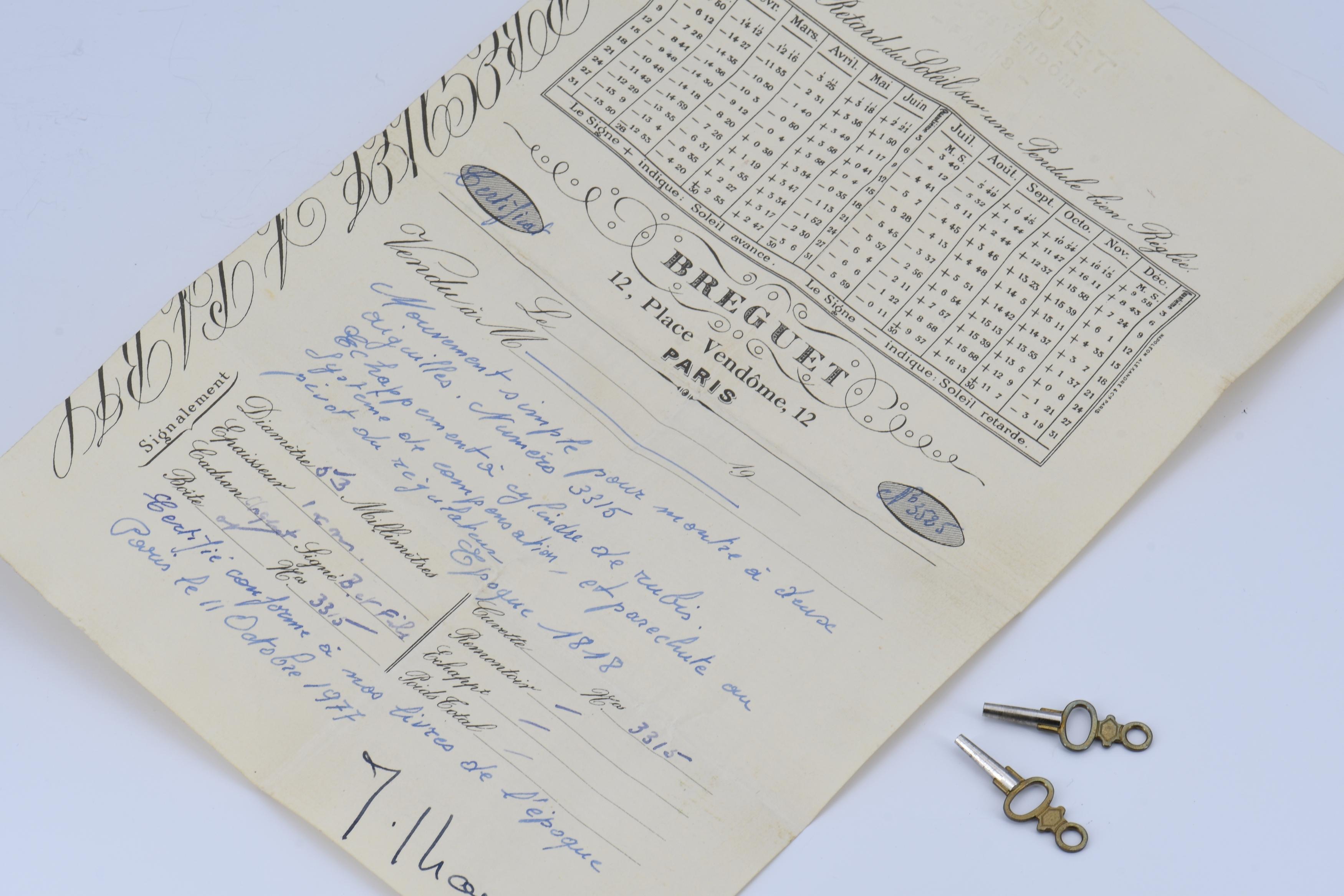 "Hor ger de la Marine royale". Breguet Zertifikat von 1977 und zwei Aufziehschlüssel anbei.