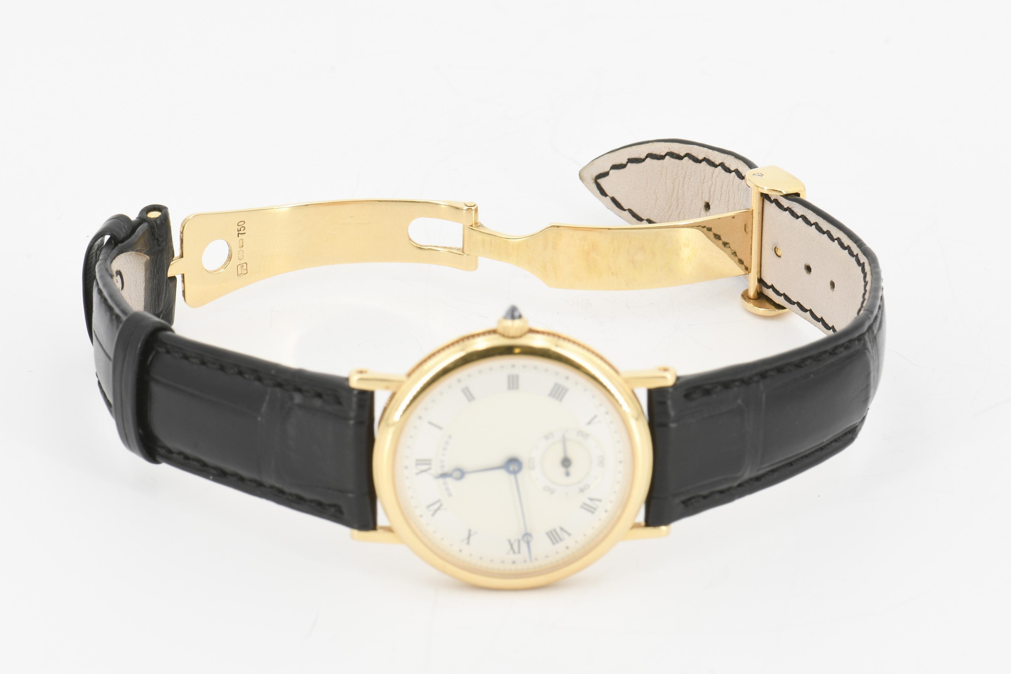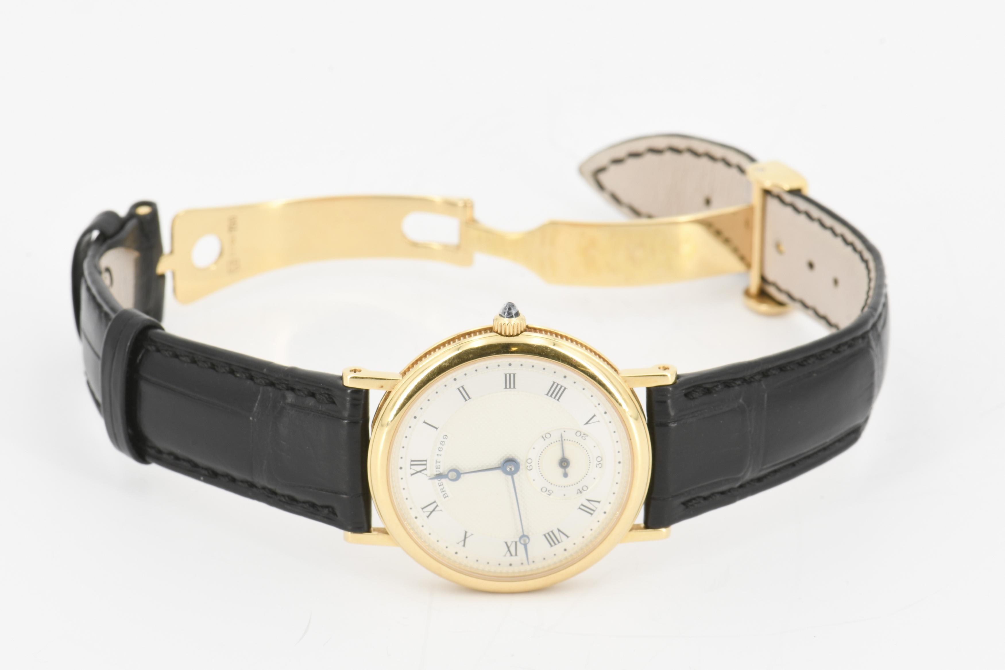 Gehäuse/Armband: 750/- Gelbgold, Lederarmband mit orig. Faltschließe, Zffbl. silbern und cremefarben guillochiert, röm. Ziffern schwarz, gebläute Breguet Zeiger.