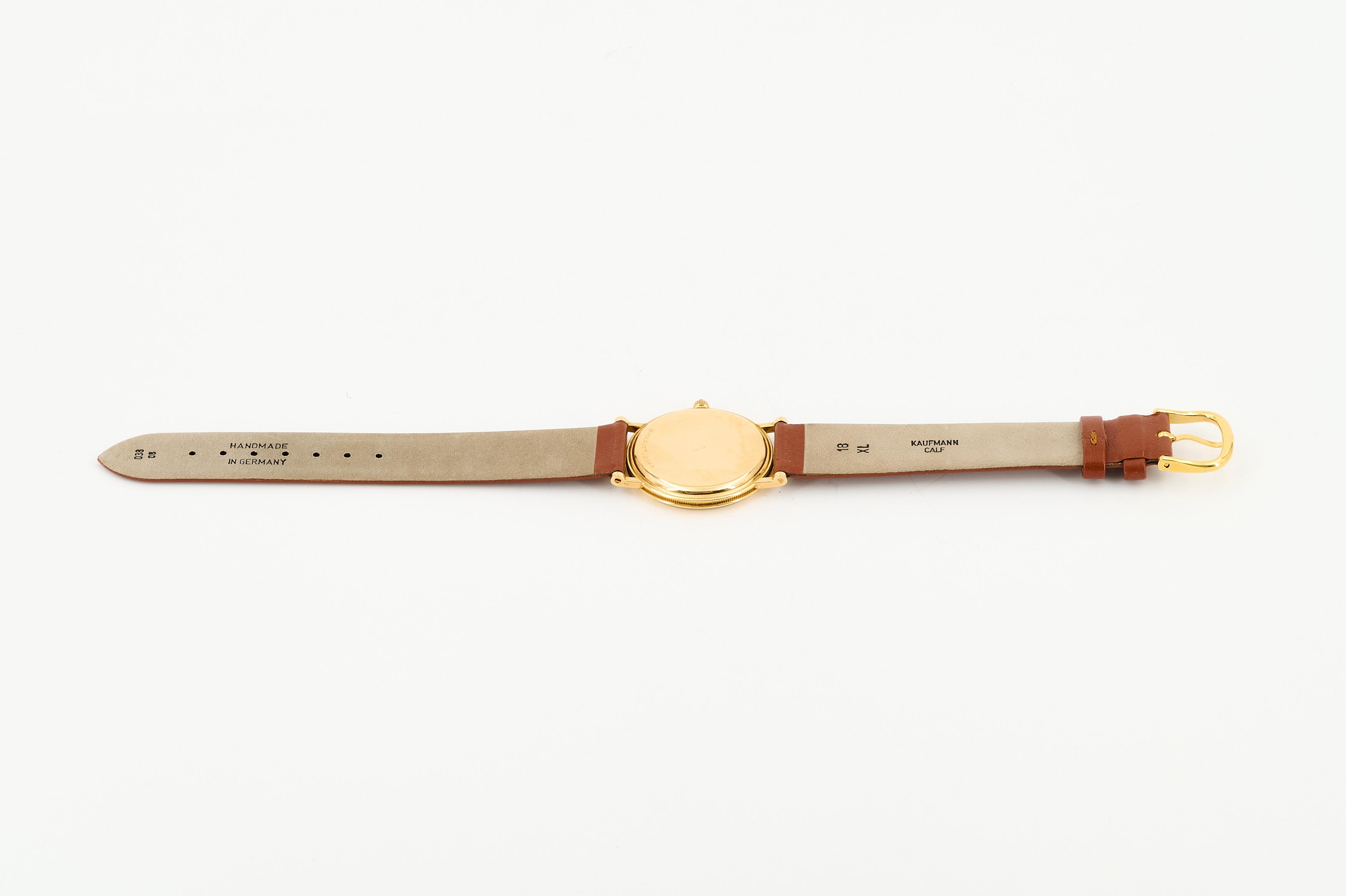 Gehäuse/Armband: 750/- Gelbgold, Lederarmband mit Dornschließe, Zffbl. schwarz und golden, Zeiger golden, römische Ziffern schwarz.
