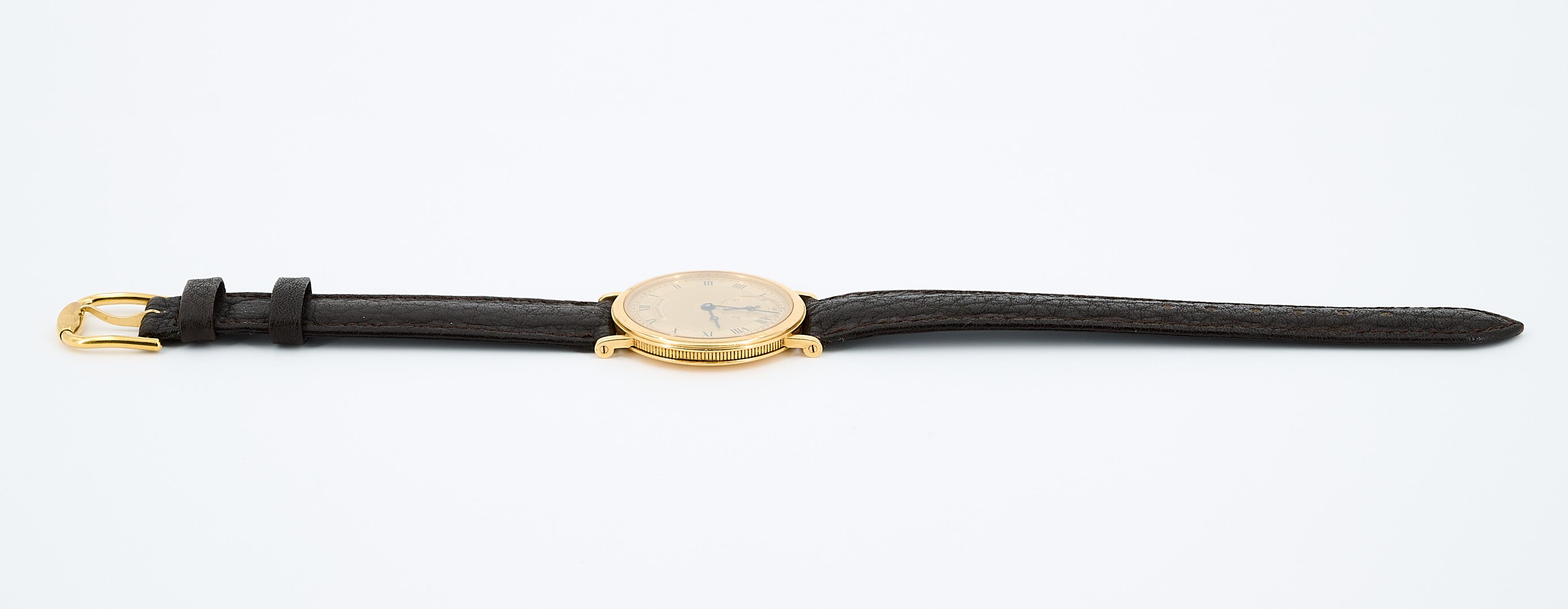 Gehäuse/Armband: 750/- Gelbgold, Lederband mit Dornschließe, Zffbl. golden, Zeiger gebläut, römische Ziffern schwarz.