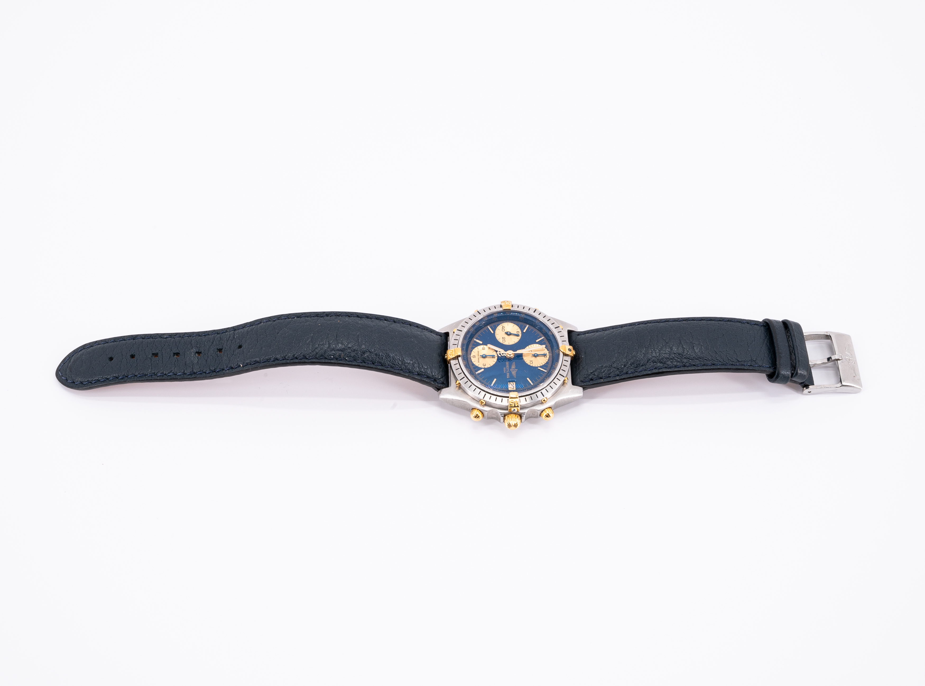 Gehäuse/Armband: Stahl, Krone, Drücker und Lünettenreiter vergoldet, Lederarmband mit Dornschließe, Zffbl. blau, Zeiger und Indizes golden, Leuchtmasse.