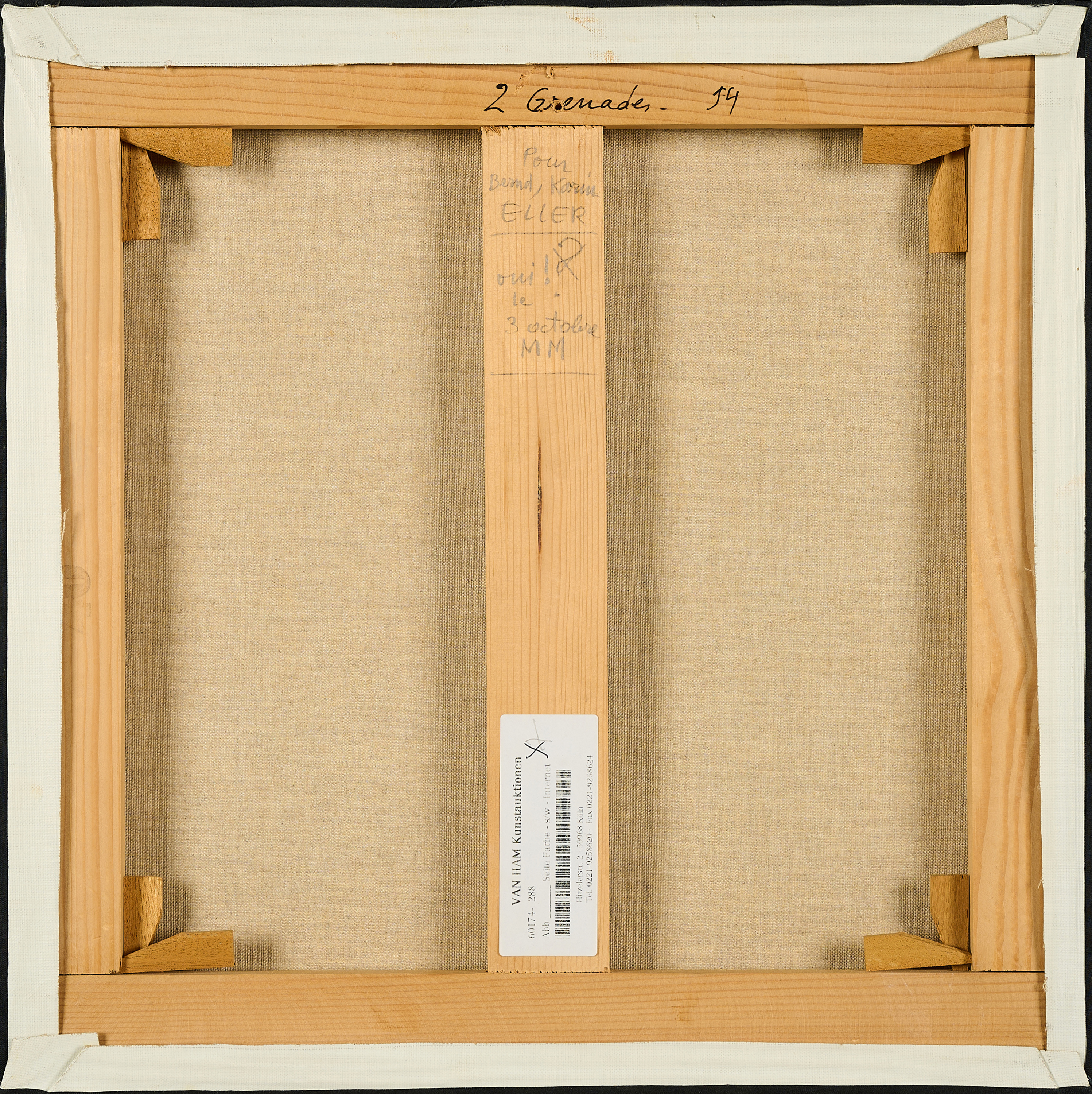Bezeichnung: Datiert und signiert unten mittig: Aout 94 COUDRAIN. Sowie betitelt und datiert verso auf dem Keilrahmen: 2 Grenades. 94 Zudem mit Widmung versehen.