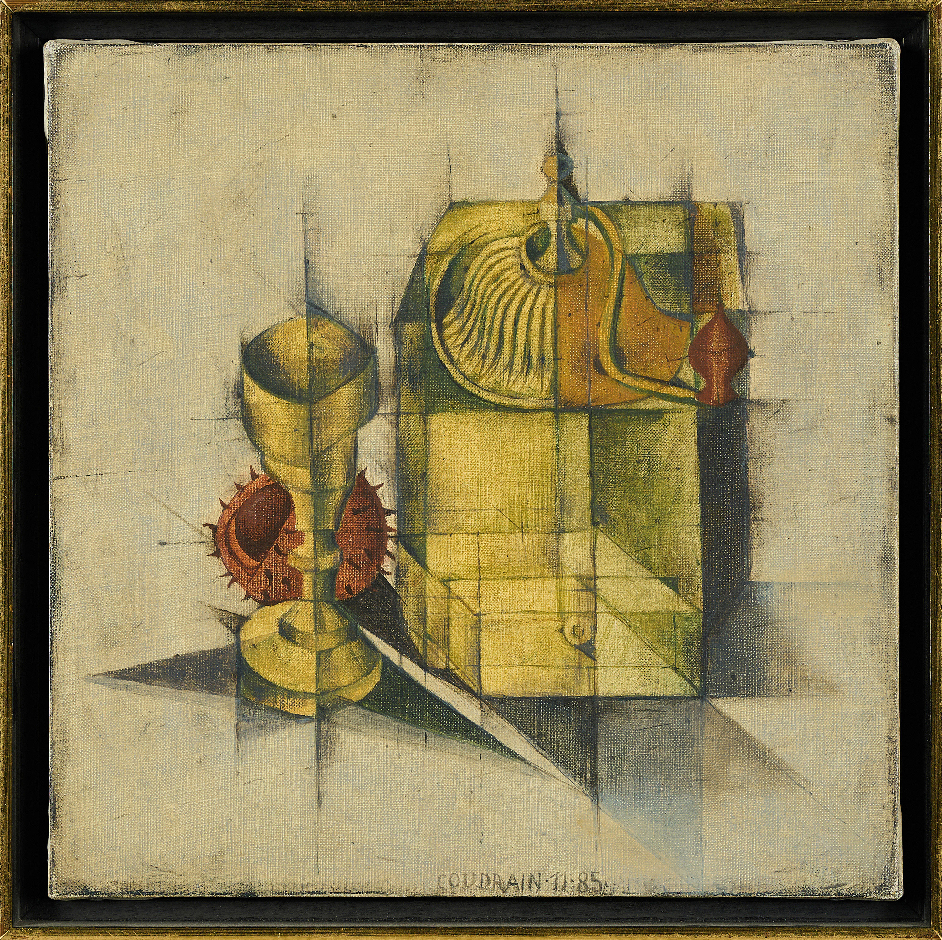 Bezeichnung: Signiert und datiert unten mittig: COUDRAIN. 11:85. Sowie betitelt verso unten auf dem Keilrahmen MOULIN A CAFE.